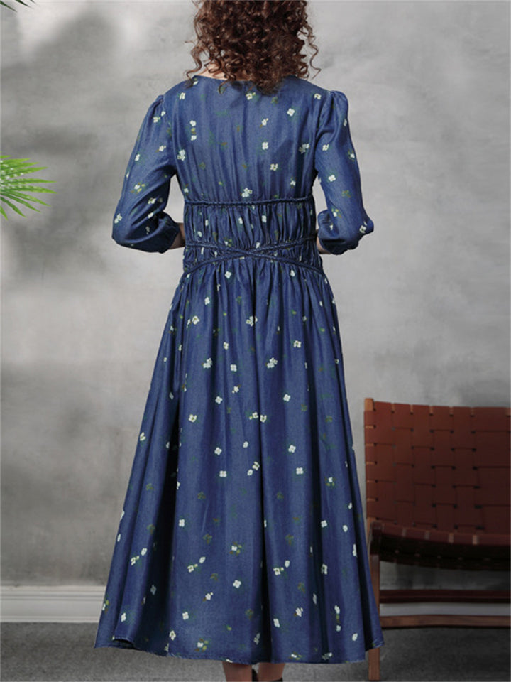 Female Retro Waisted Long Sleeve Floral Dress