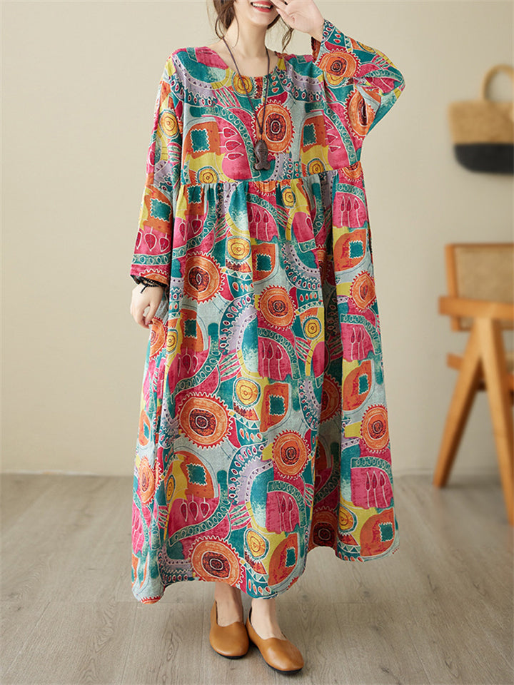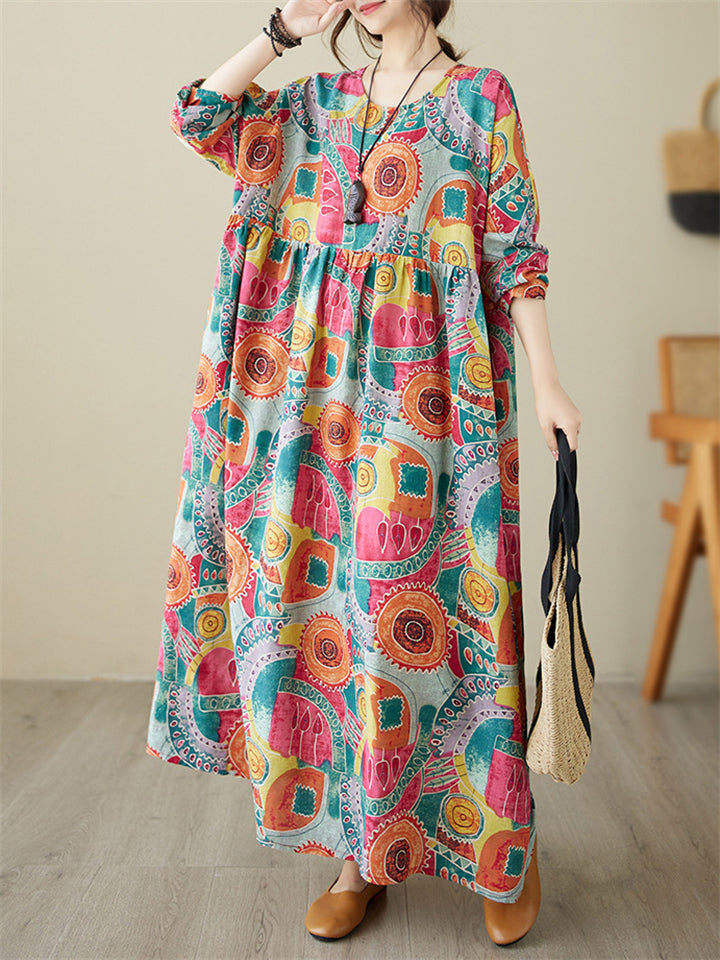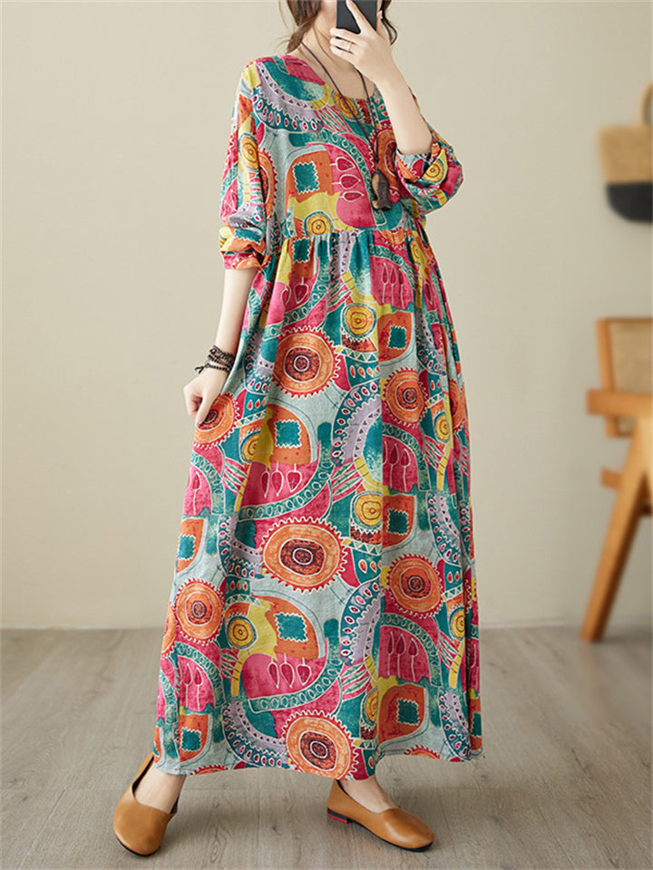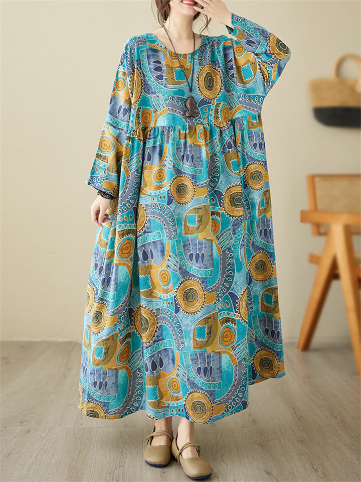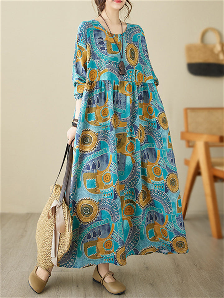 Female Tree Rings Meadows Printed Round Neck Maxi Dress