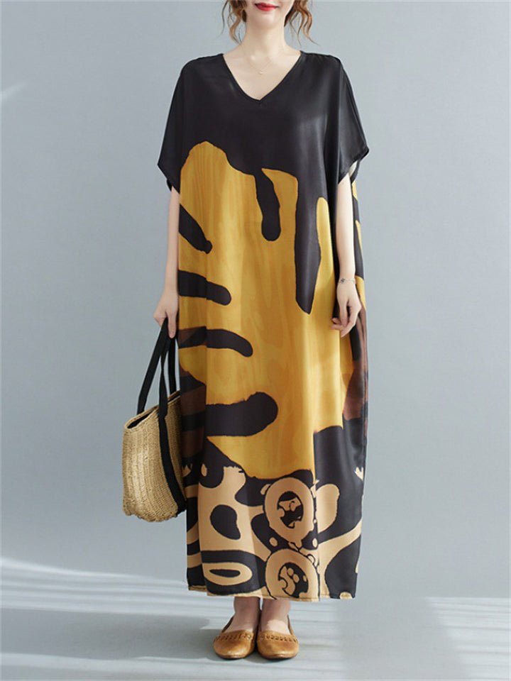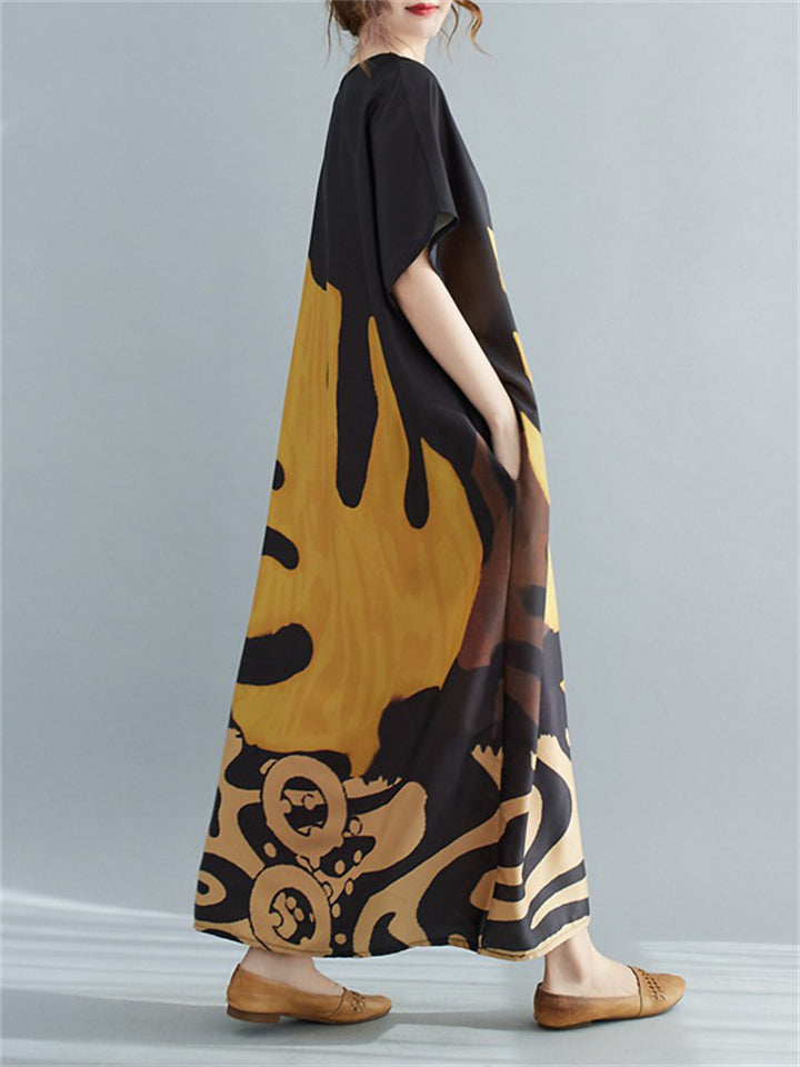 Women's Summer Printed Patchwork Half Sleeve Big Hem Maxi Dress
