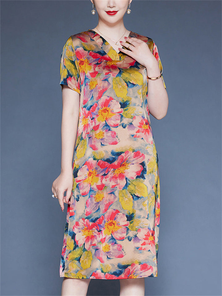Flower Print V-neck Short Sleeve A-Line Dress for Women