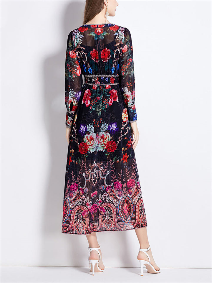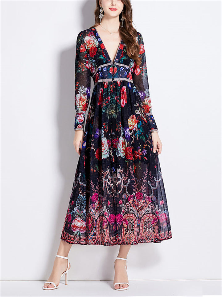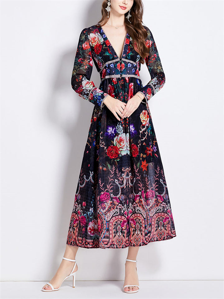 Women's Trendy Ethnic Holiday Style Print V Neck Maxi Dress