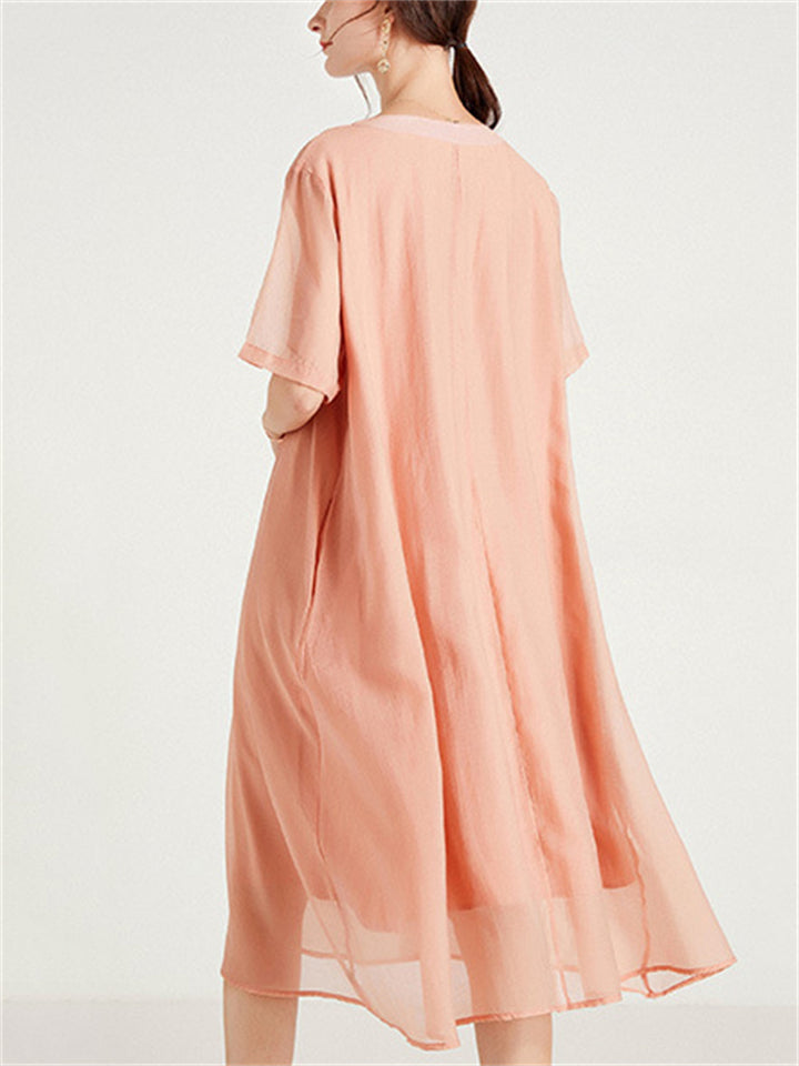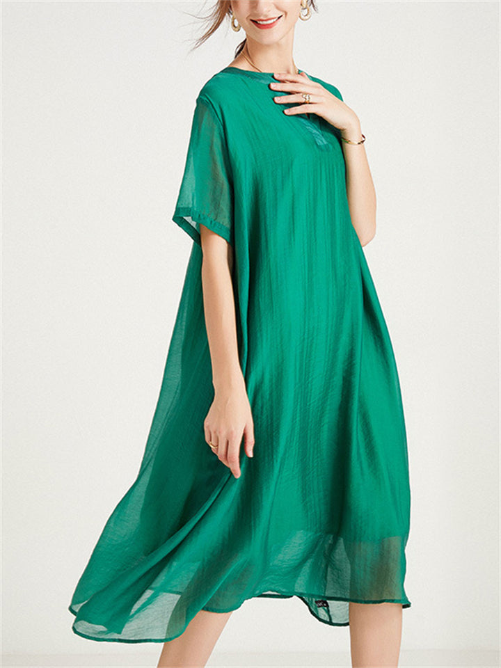 Women's Casual Solid Color Round Neck Double-layer Big Hem Midi Dress