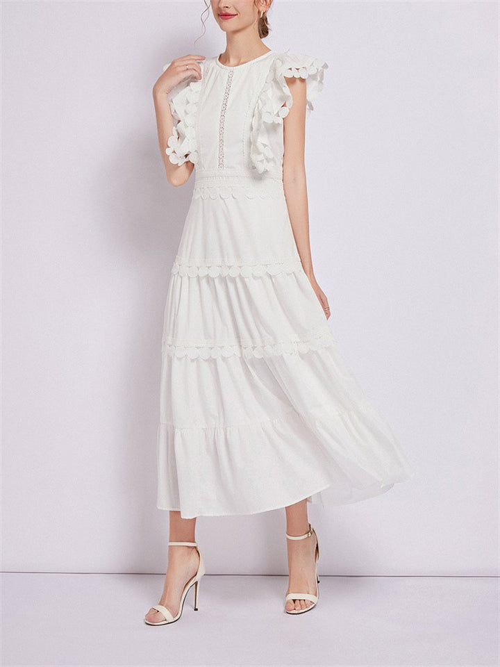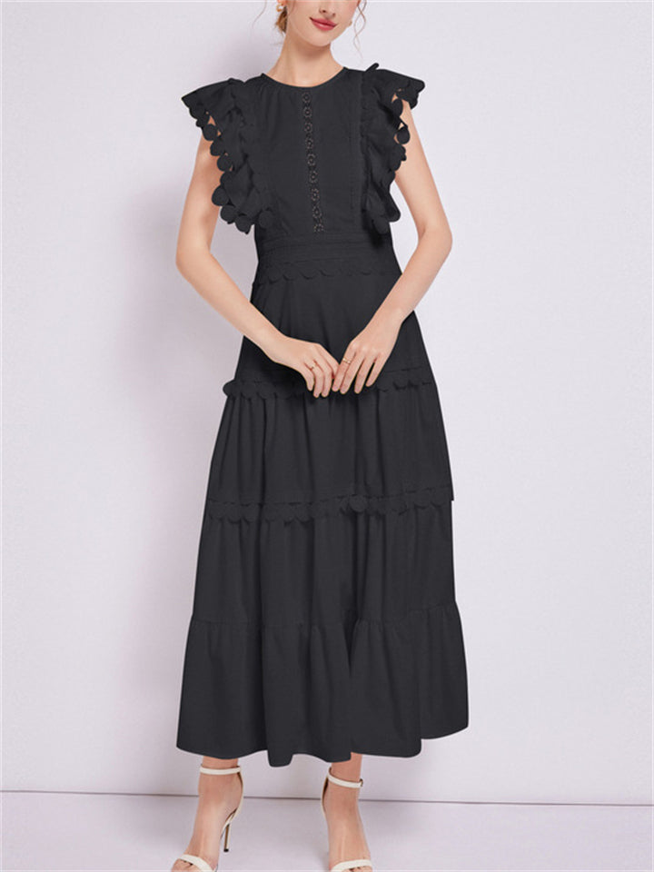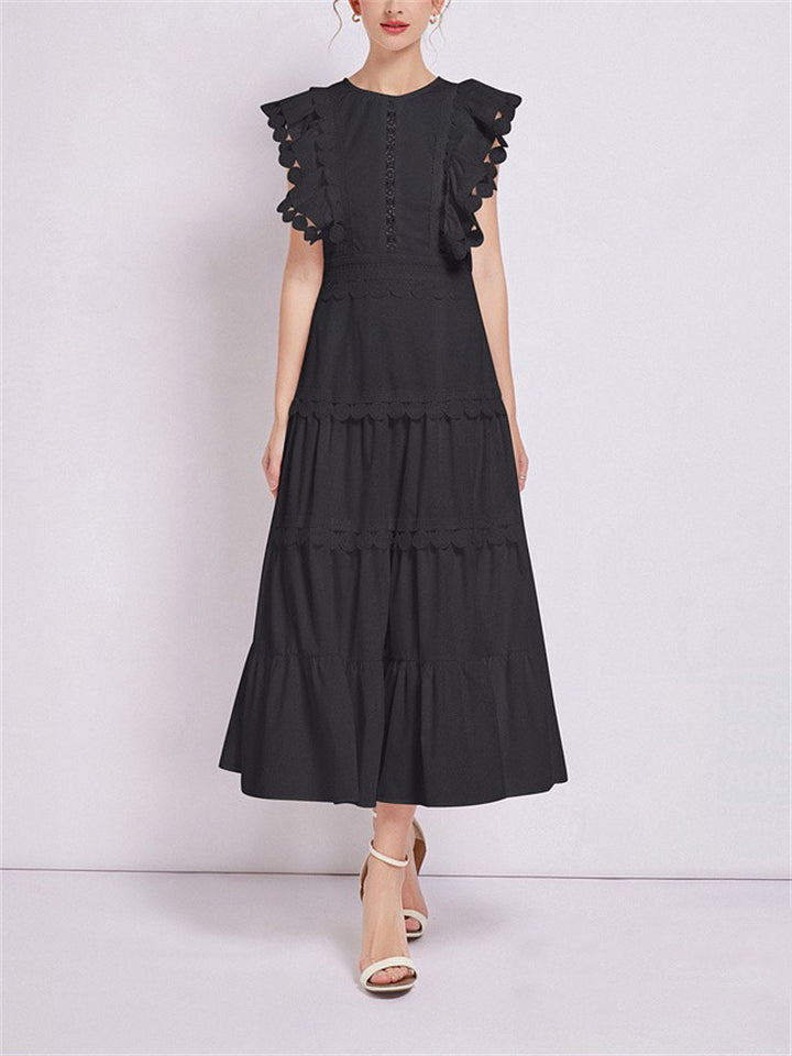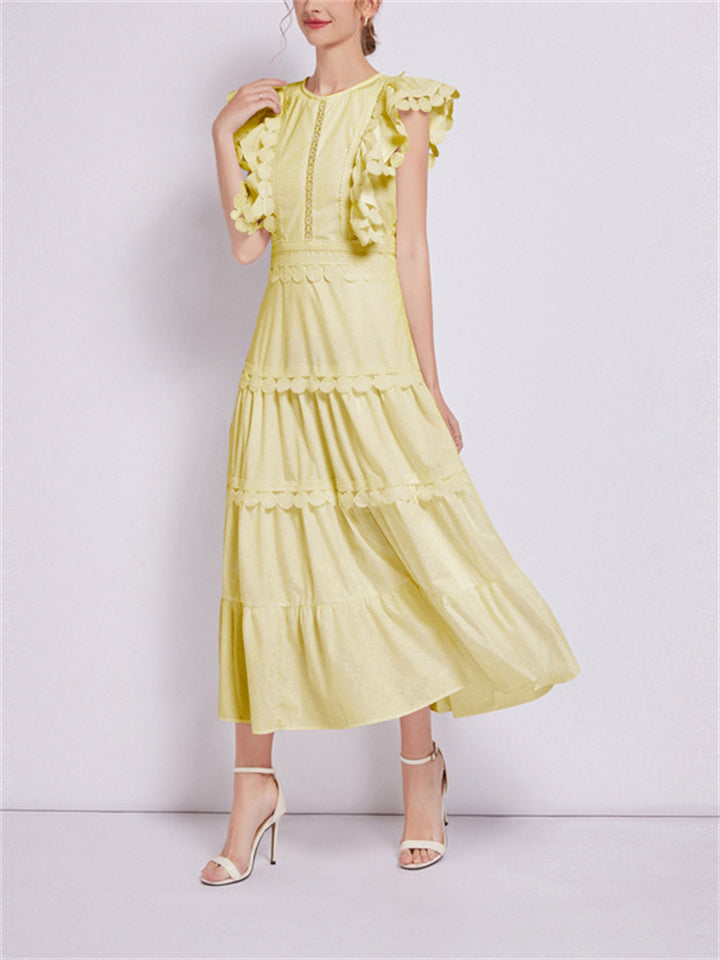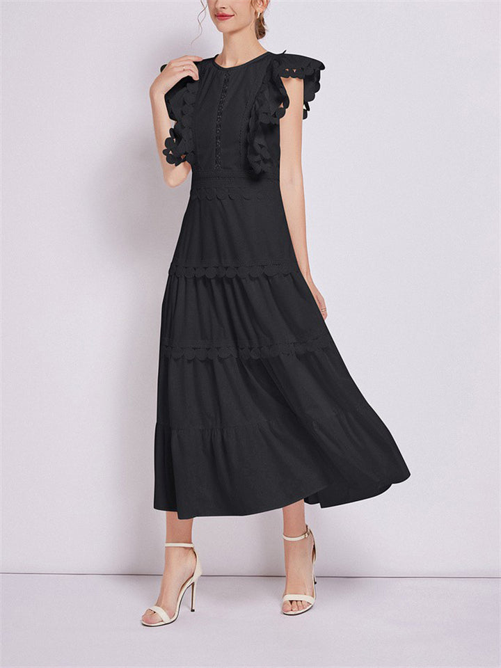 Ladies Fashion Spliced Crew Neck Flutter Sleeve Dresses
