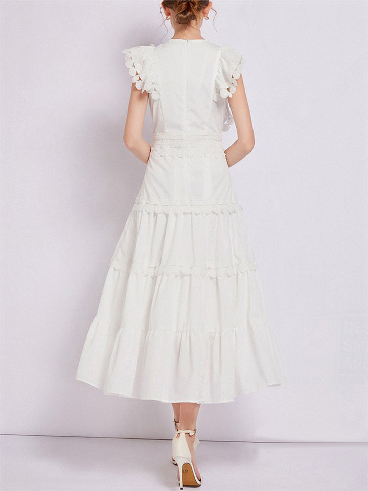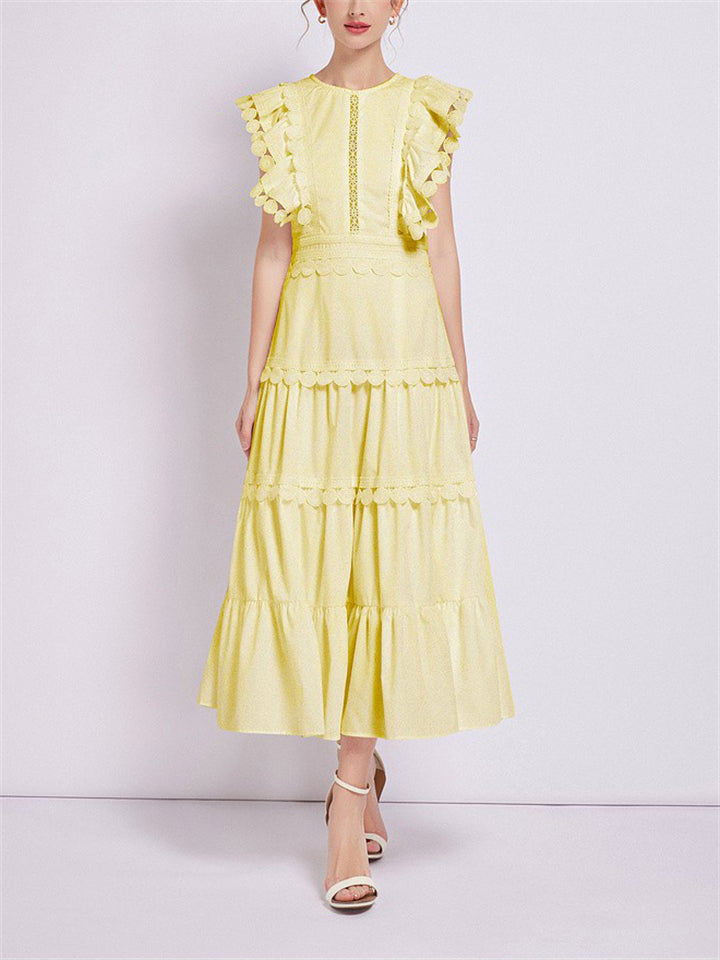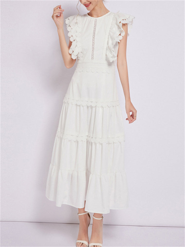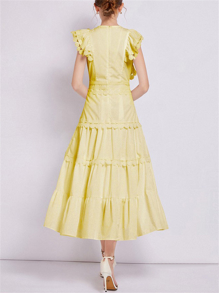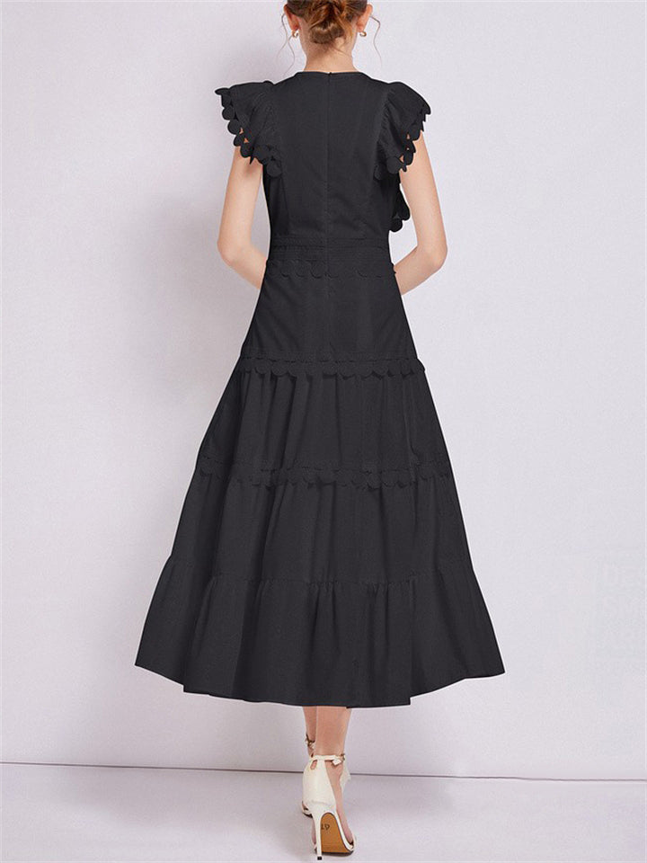 Ladies Fashion Spliced Crew Neck Flutter Sleeve Dresses