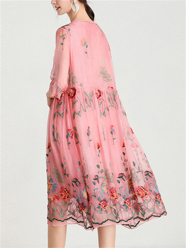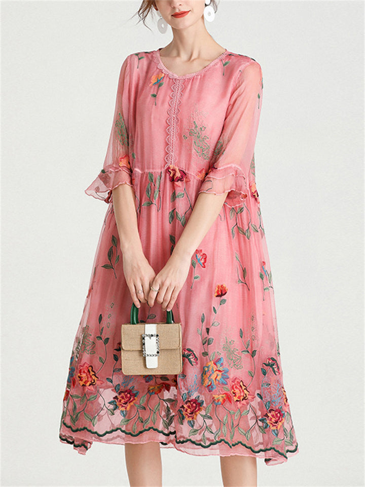 Ladies Floral Embroidered Comfortable Mid-Length Dress