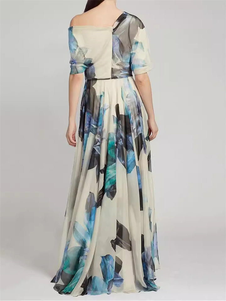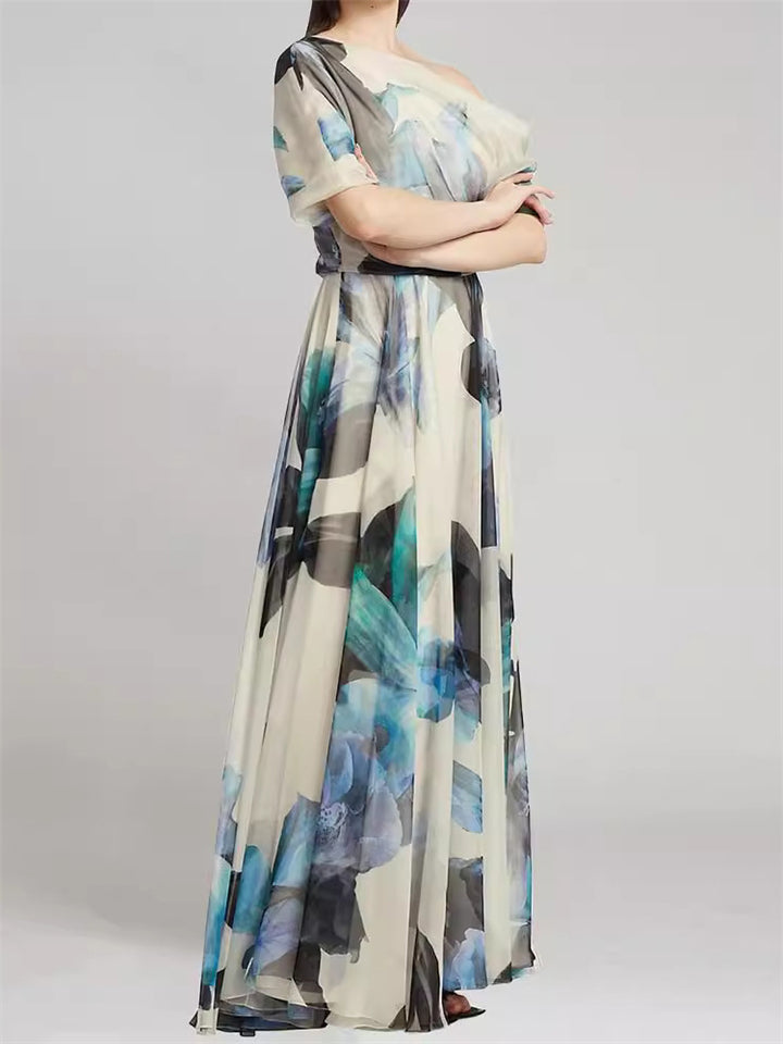 Ladies Irregular One-Shoulder Printed Chiffon Dress