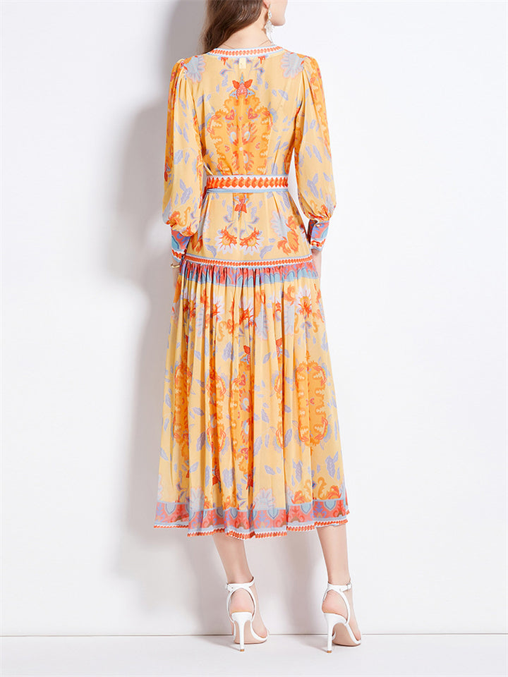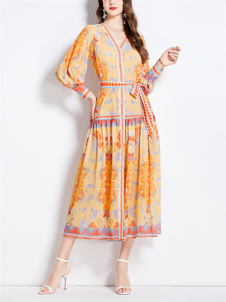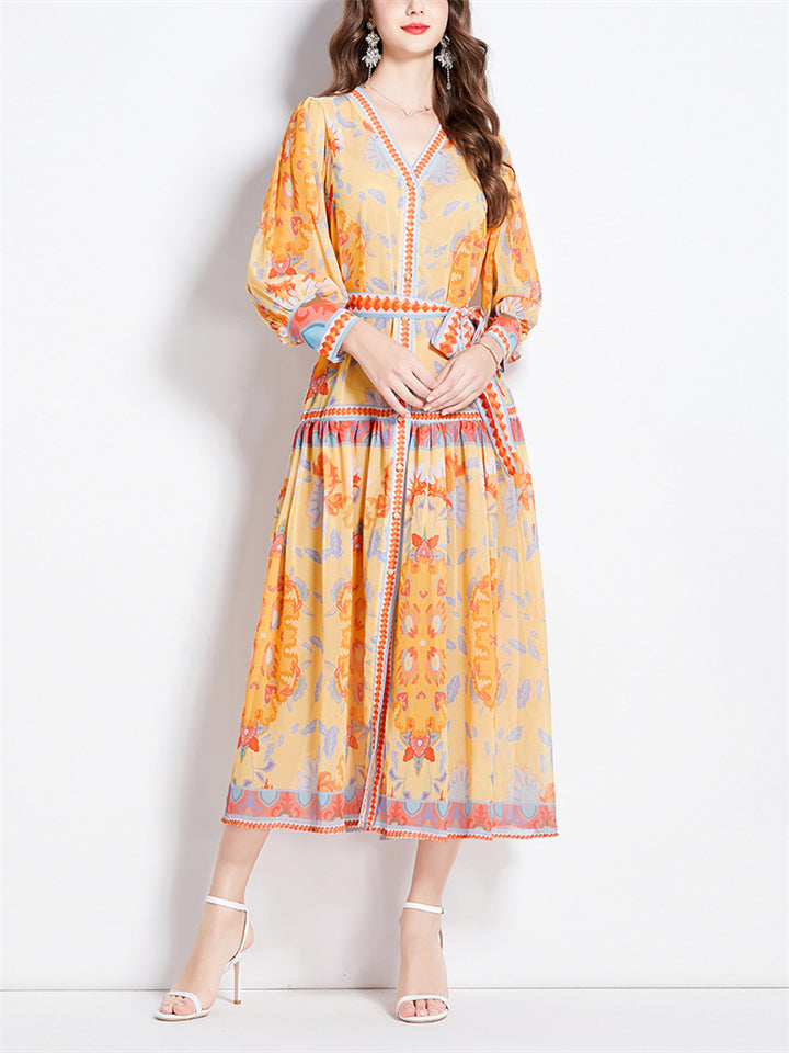 Ladies V-neck Lantern Sleeve Printed Chiffon Dress