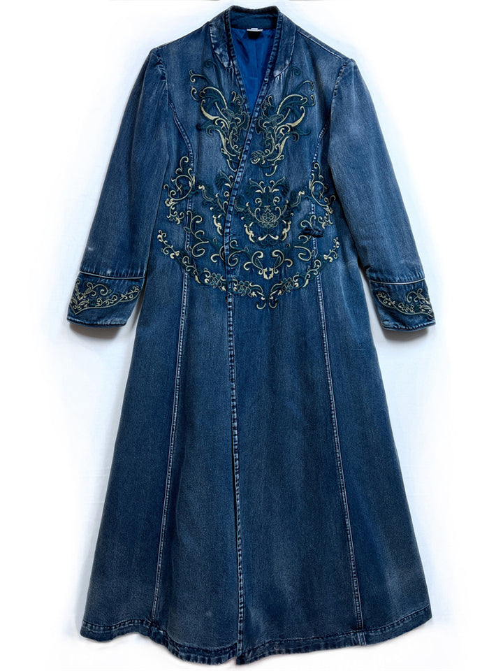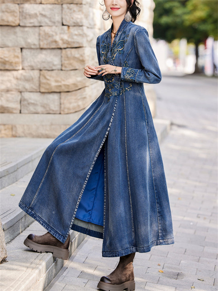 Ladies Vintage Embroidery V-Neck Side Slit Denim Dress