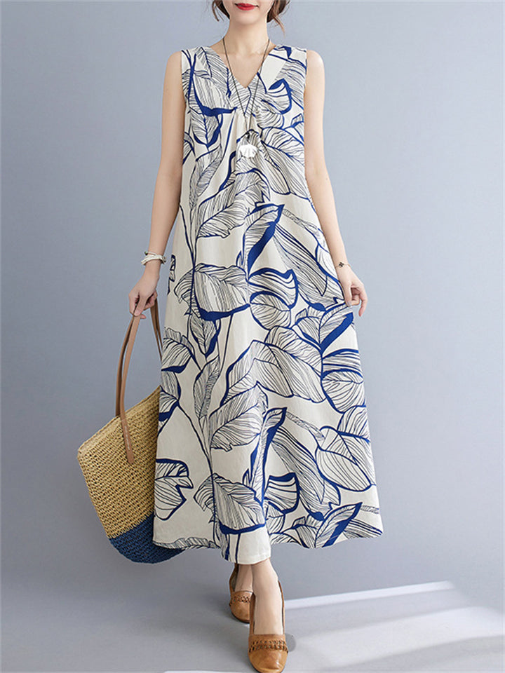 Women's Summer Elegant Flowers Printed V Neck Sleeveless Dress