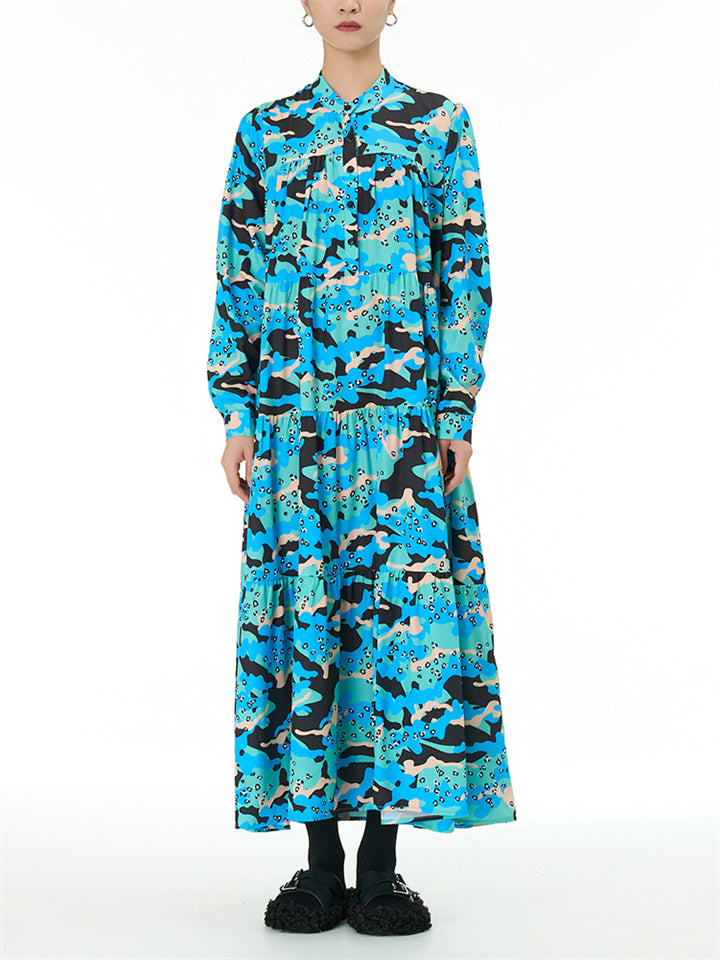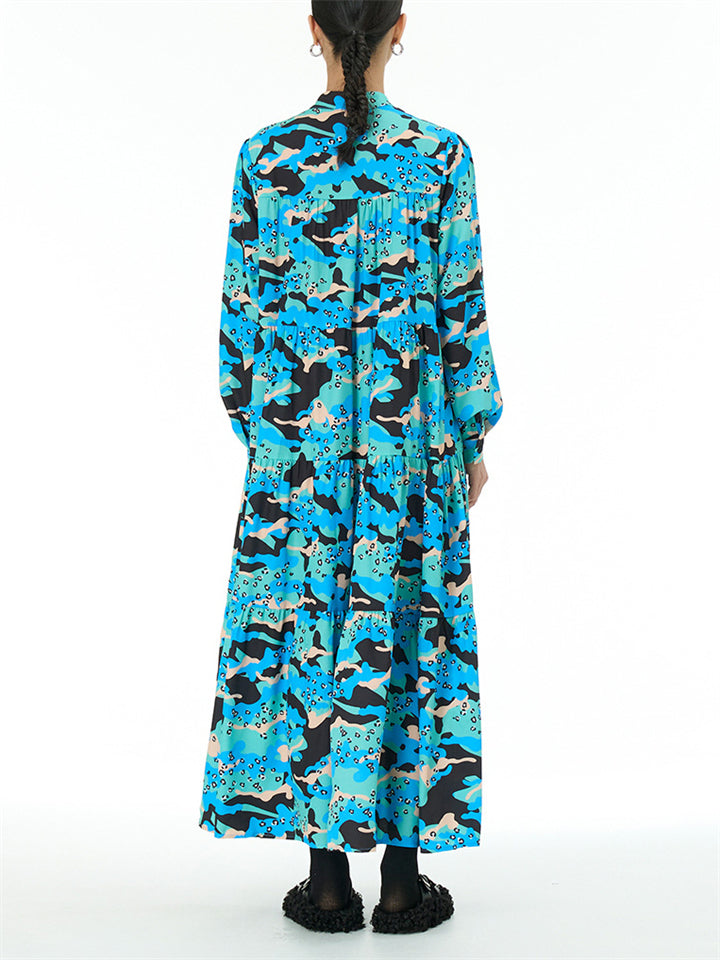 Women's Printed Denim Chiffon Patchwork Big Hem Dress