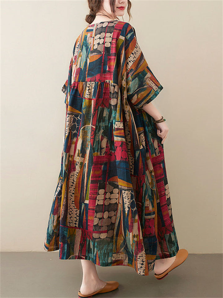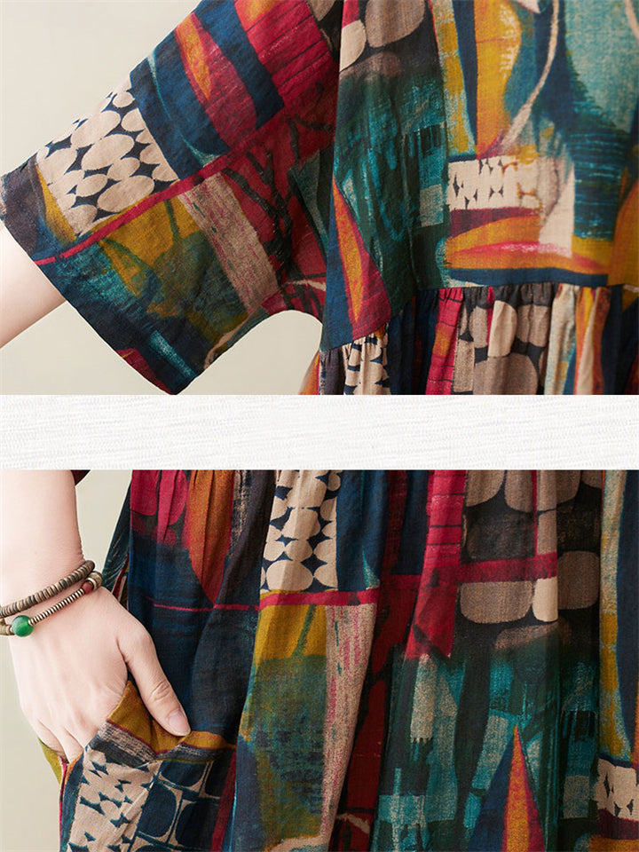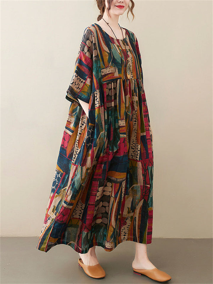 Women's Summer Printed Patchwork Half Sleeve Big Hem Maxi Dress