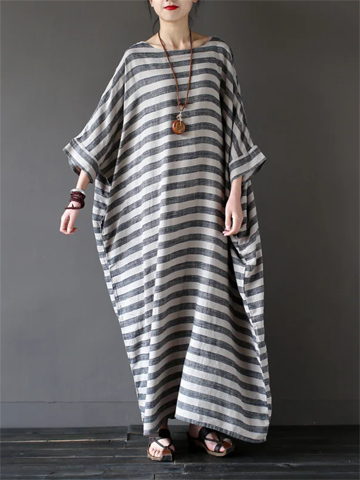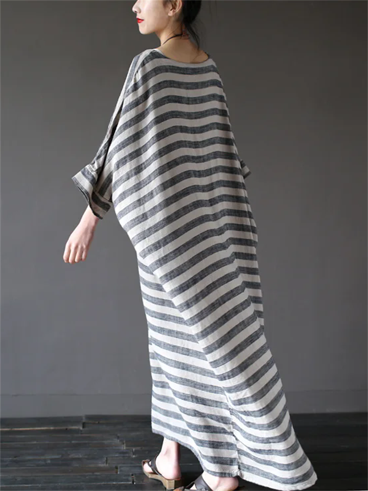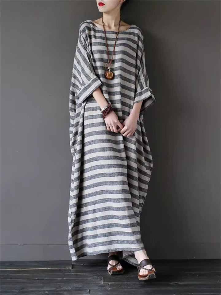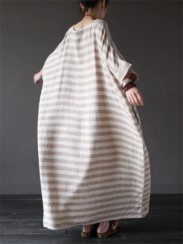 Relaxed Stripe Round Neck Cotton Linen Long Dress for Lady