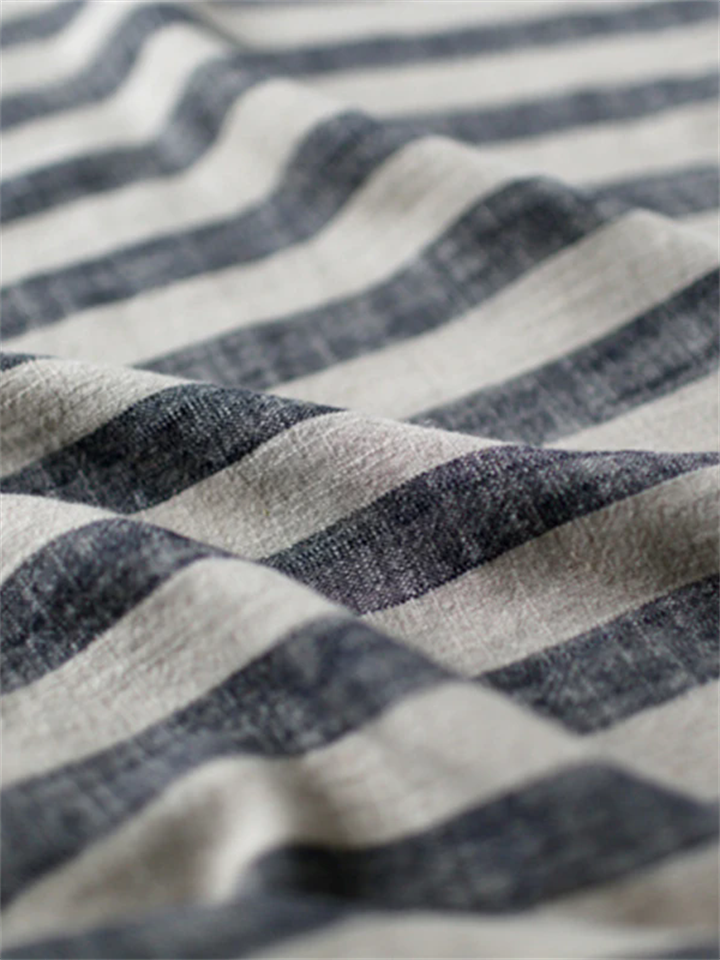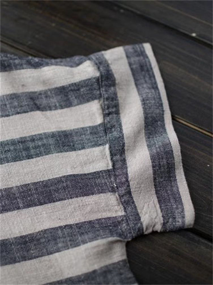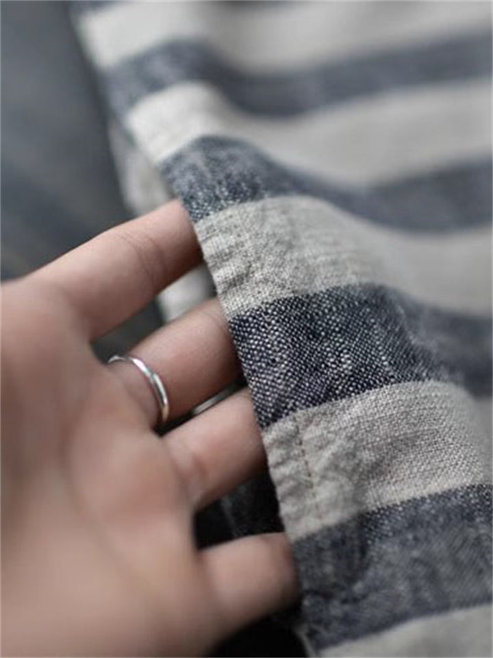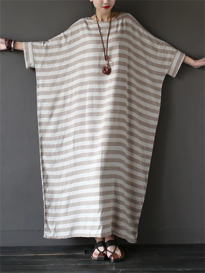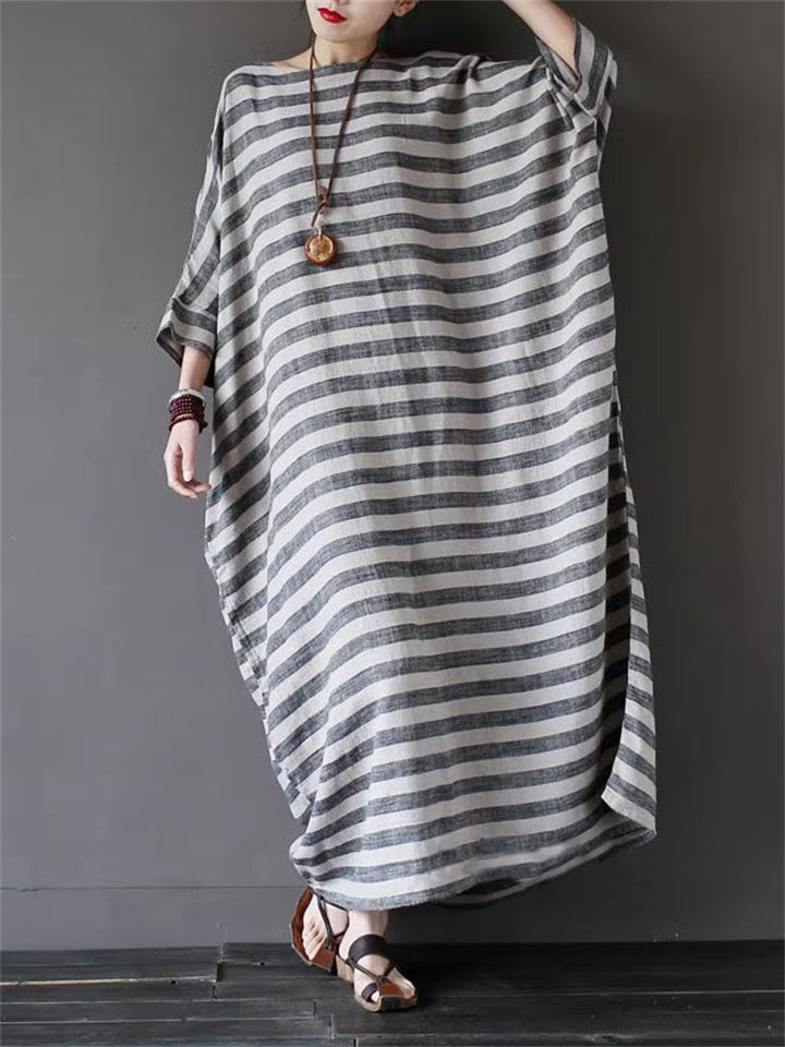 Relaxed Stripe Round Neck Cotton Linen Long Dress for Lady