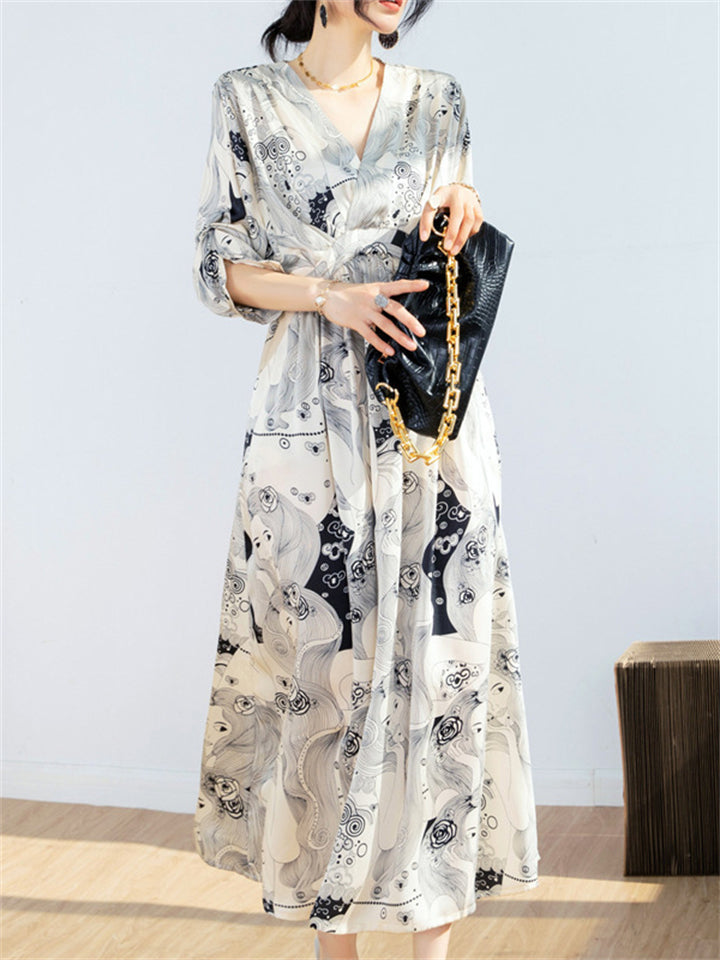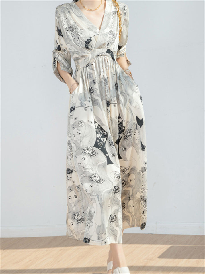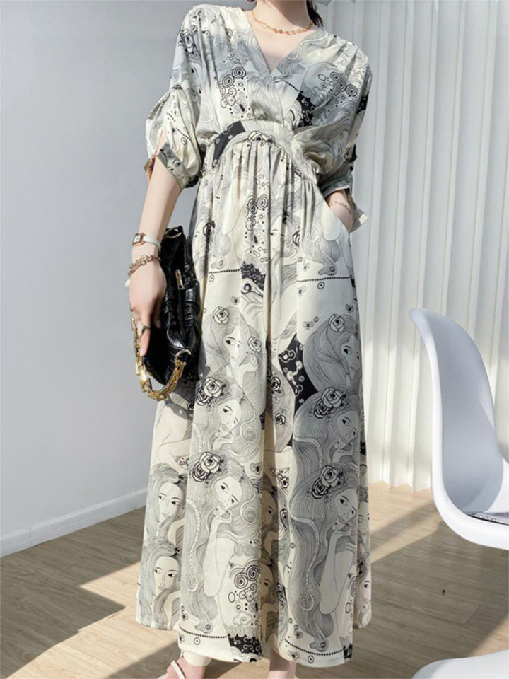 Retro V Neck Half Sleeve Cartoon Girl Print Dress for Ladies