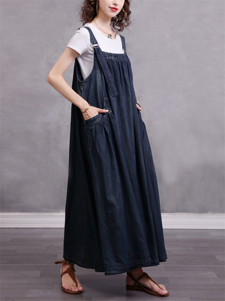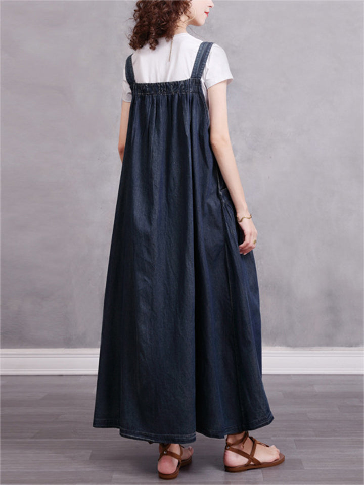 Women's Casual Blue Printed Sleeveless Strappy A-Line Demin Dress