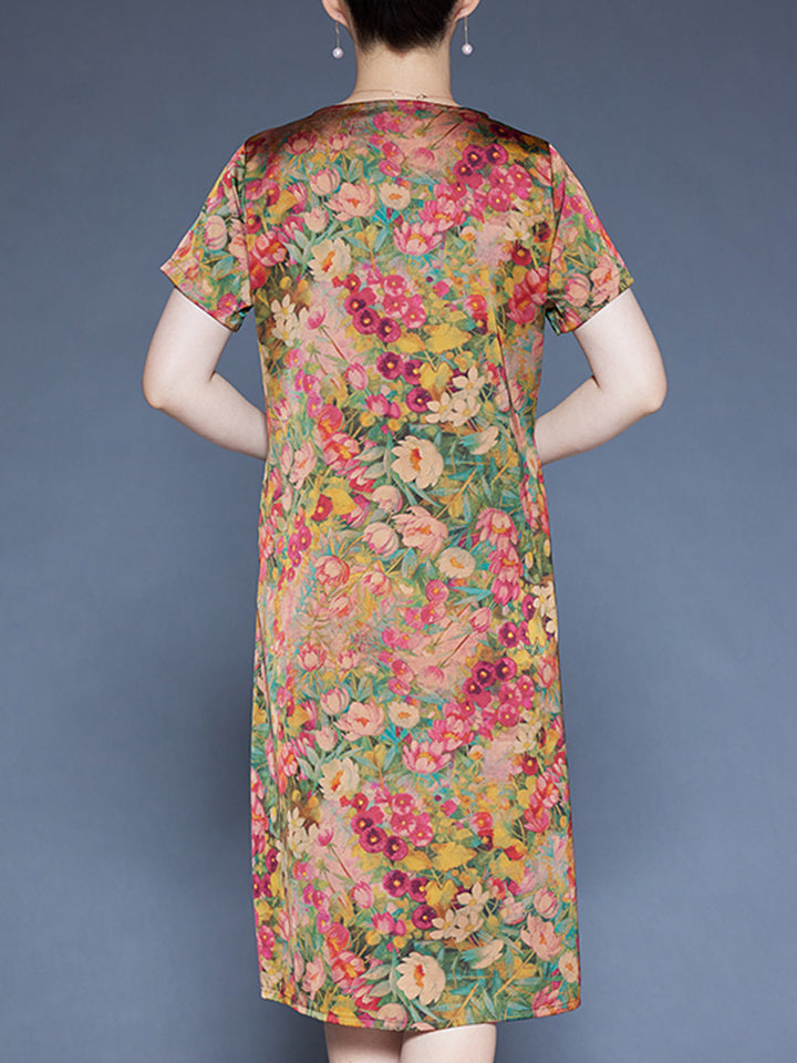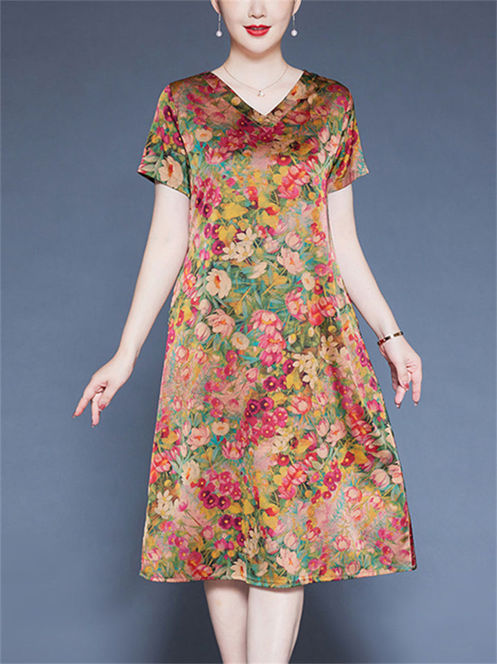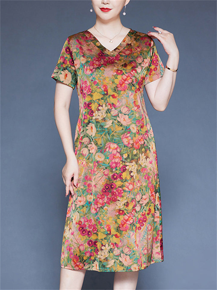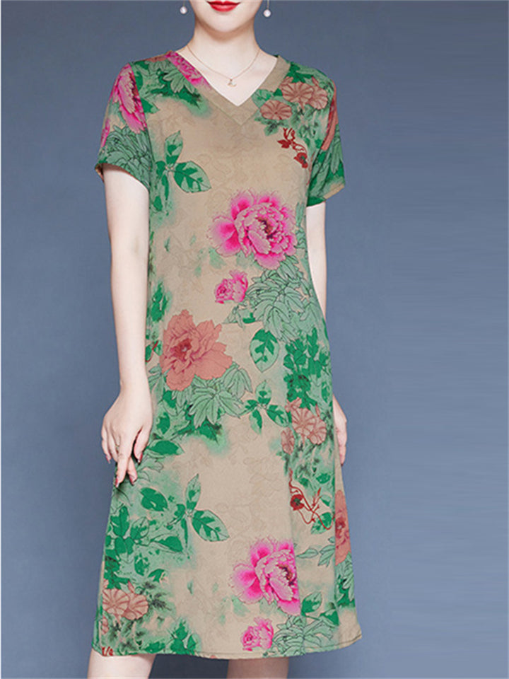 Summer Casual V-neck Floral Print Short Sleeve Dress for Women
