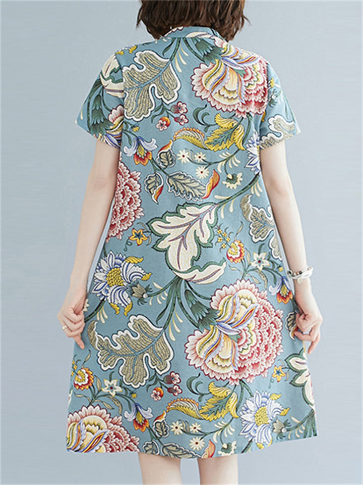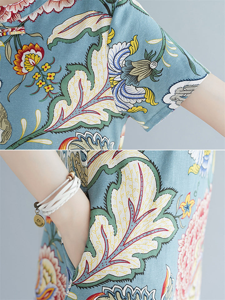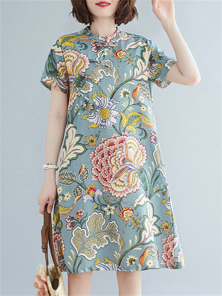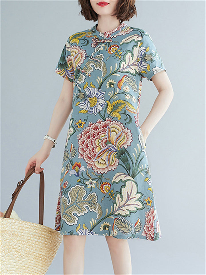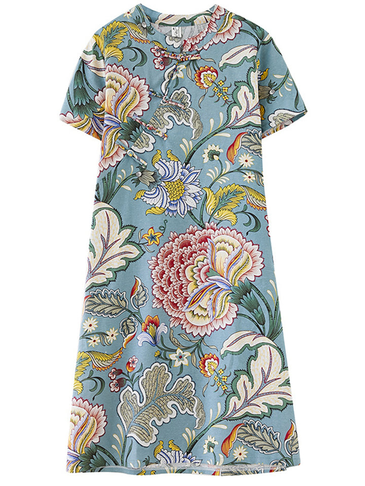 Summer Female Floral Print Round Neck Elegant Knee Length Dress