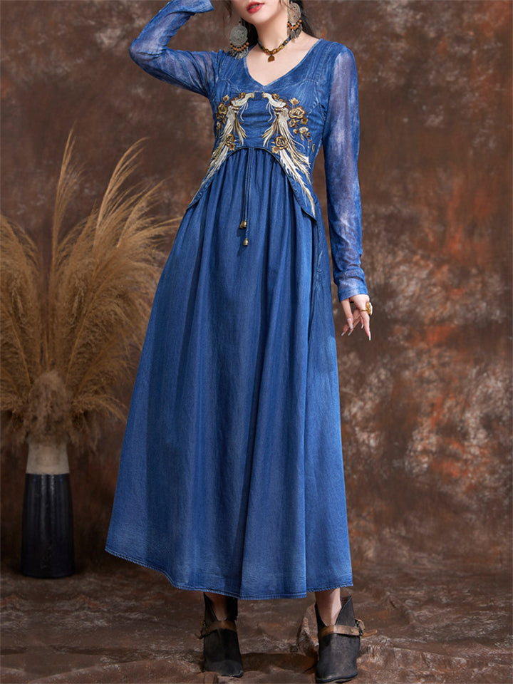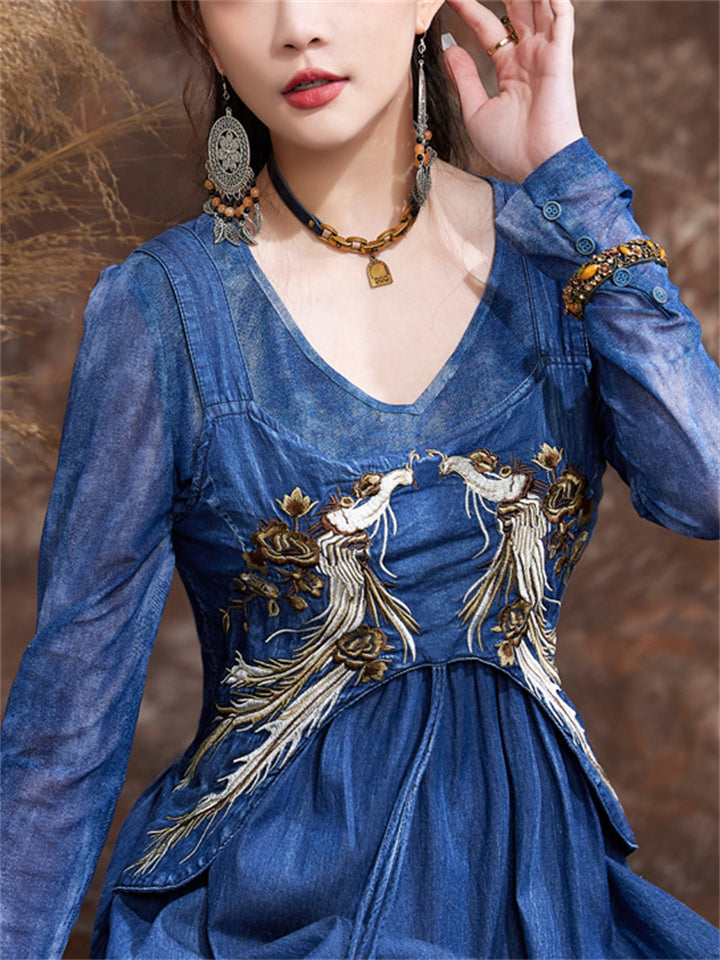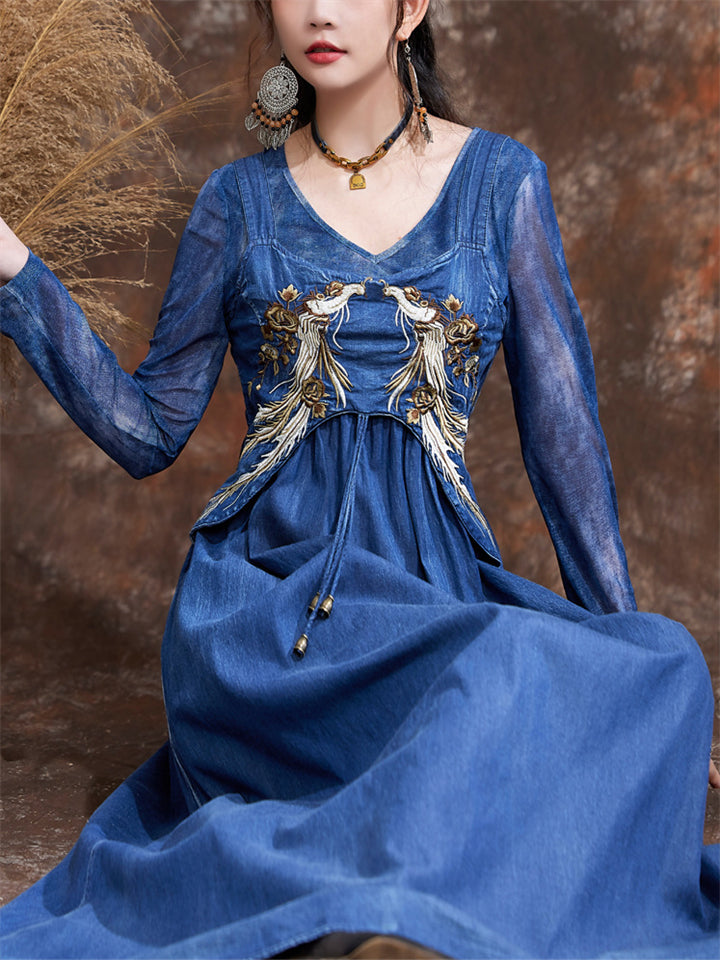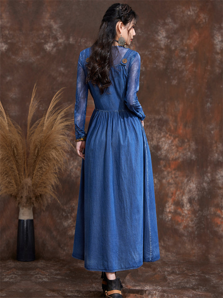 Women's Printed Denim Chiffon Patchwork Big Hem Dress