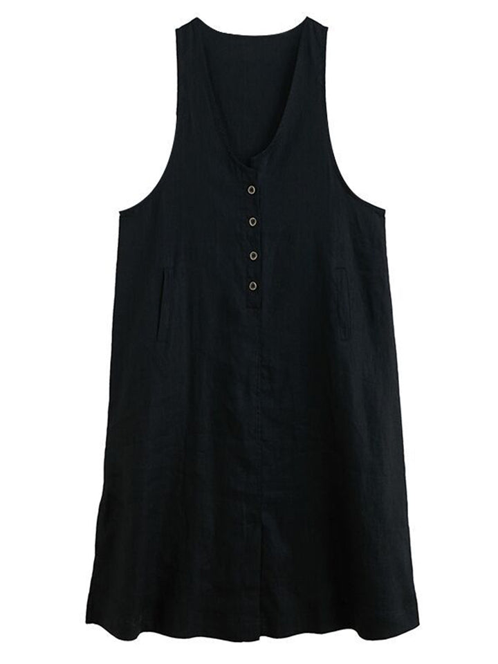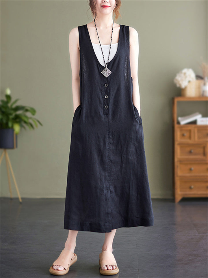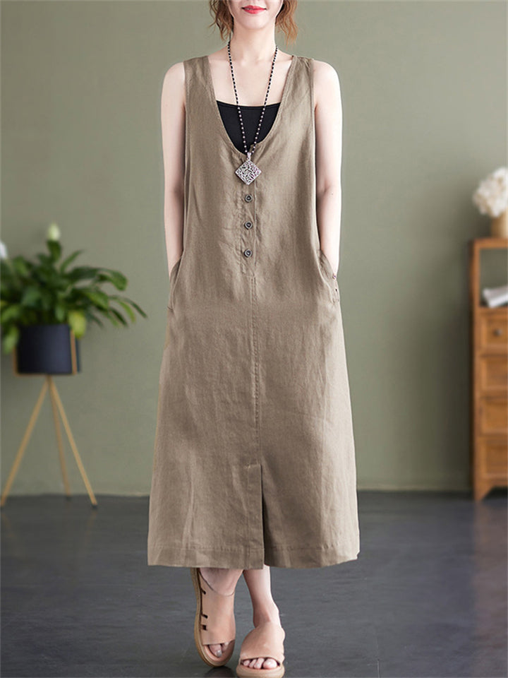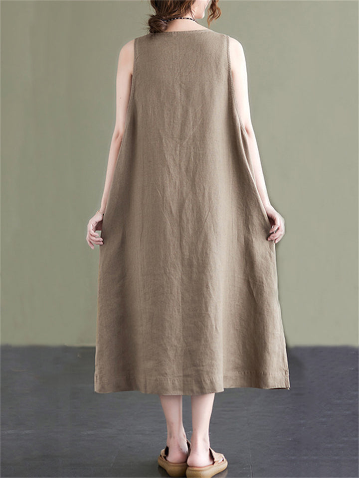 Summer U Neck Sleeveless Loose Linen A-Line Dress for Women