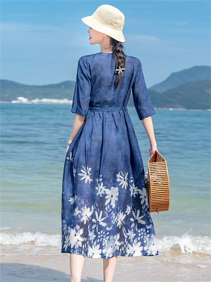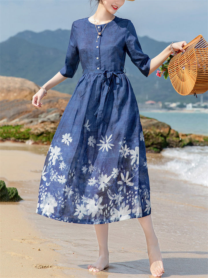 White Flower Print Round Neck Half Sleeve Blue Dress for Lady