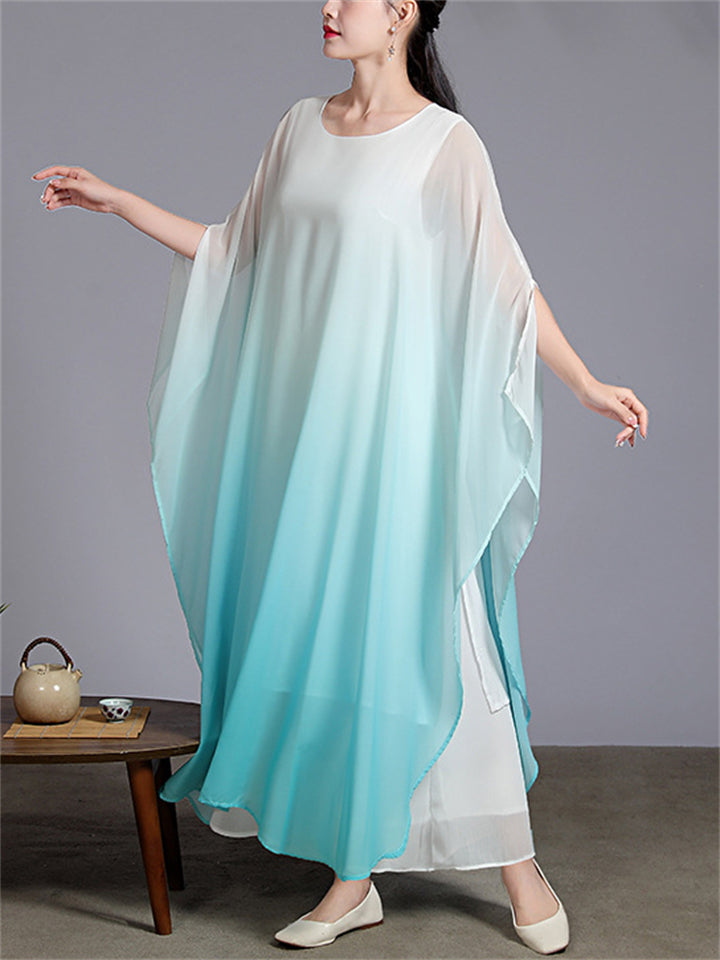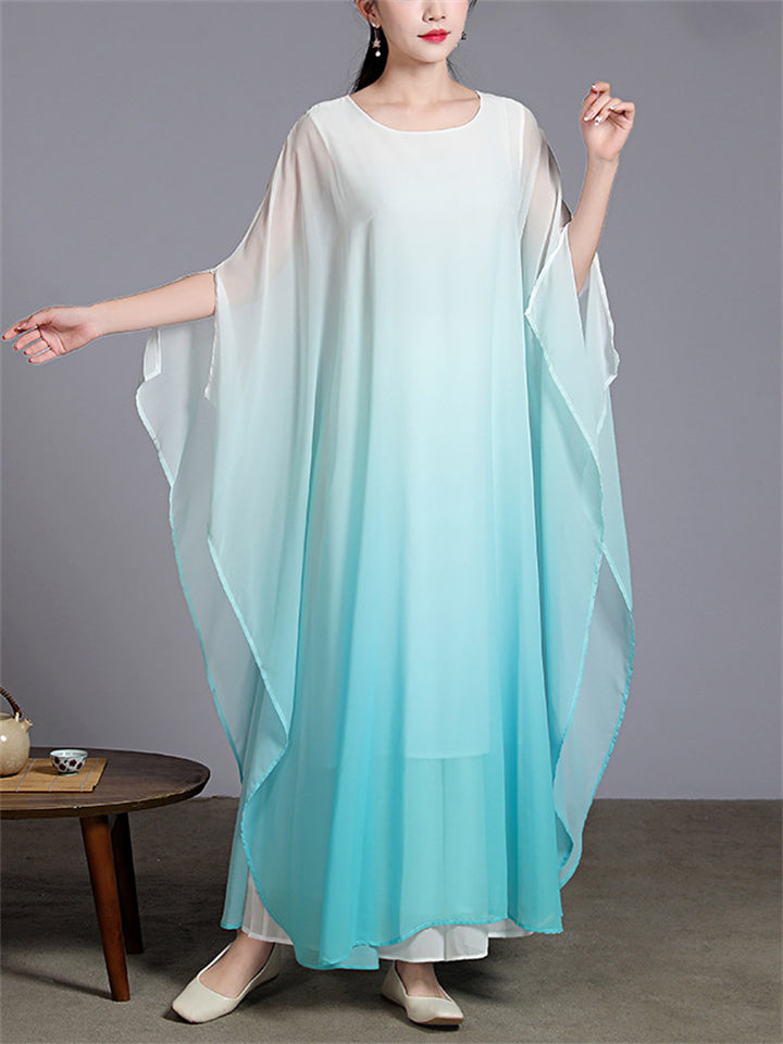 Women's Casual Solid Color Round Neck Double-layer Big Hem Midi Dress