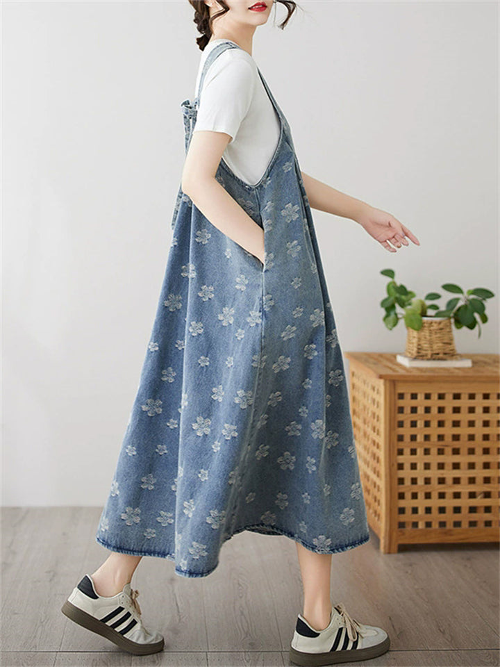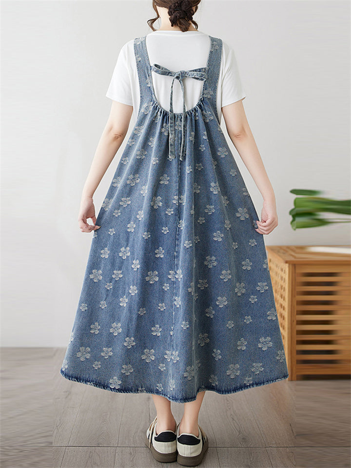 Women's Casual Blue Printed Sleeveless Strappy A-Line Demin Dress