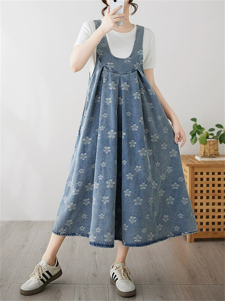 Women's Printed Denim Chiffon Patchwork Big Hem Dress