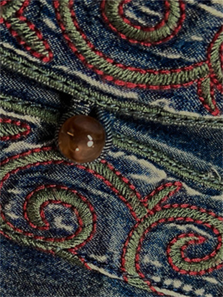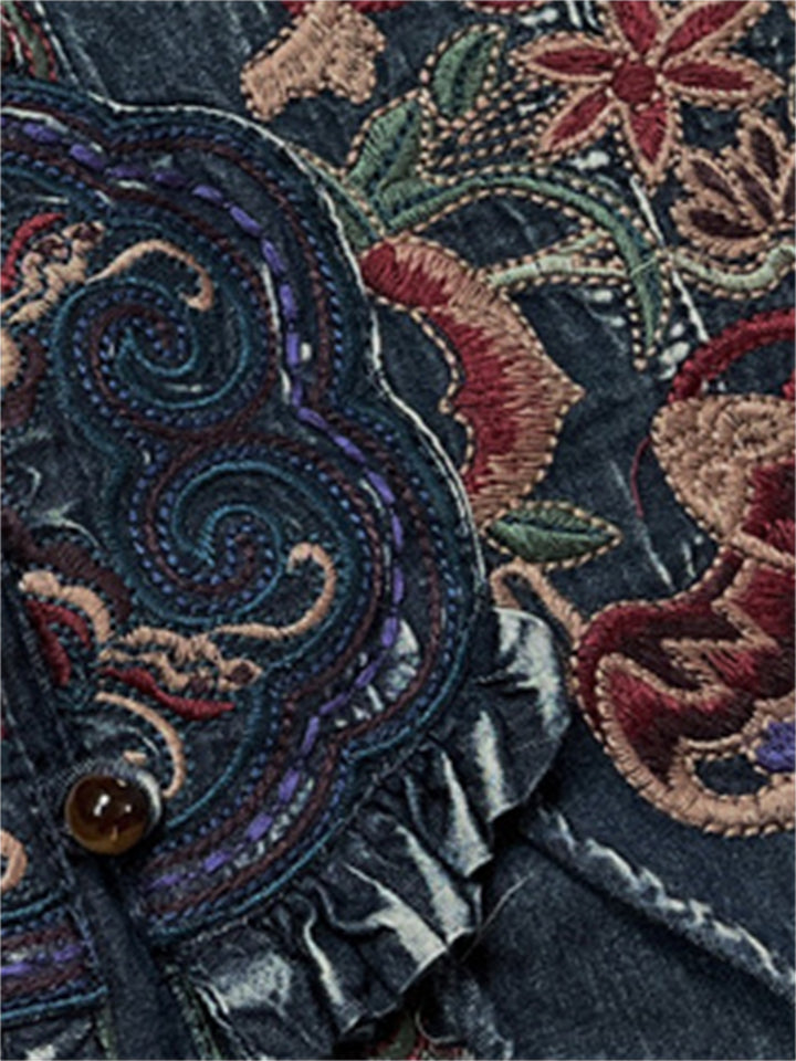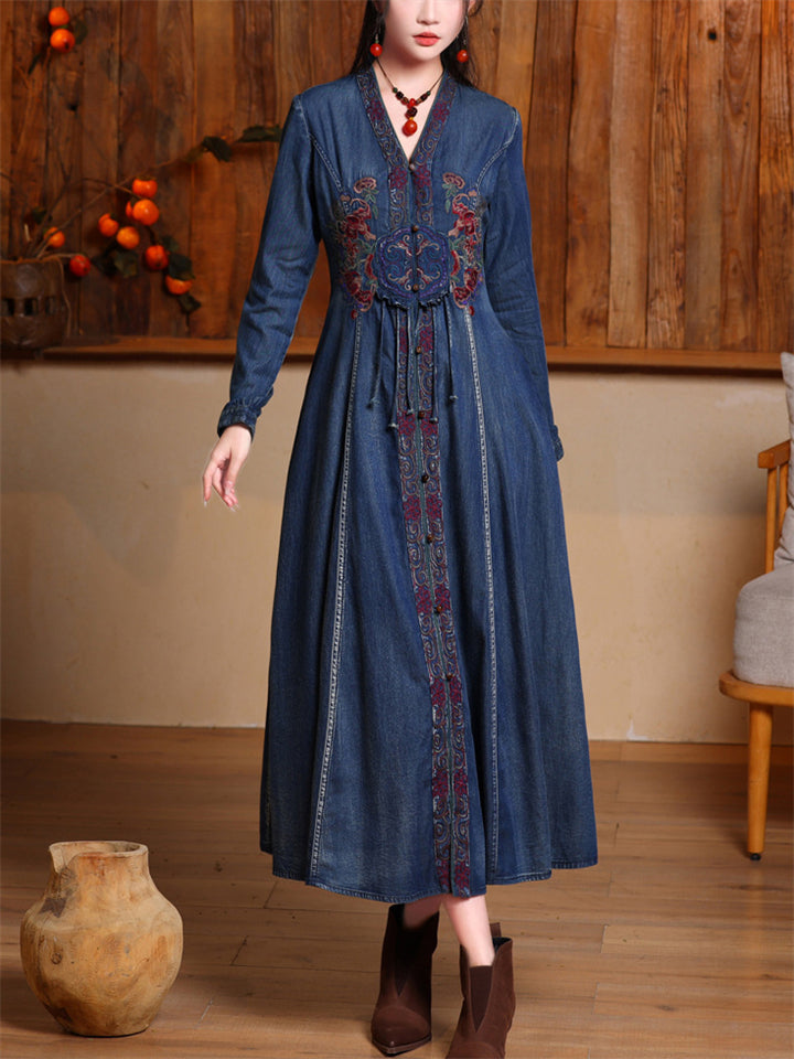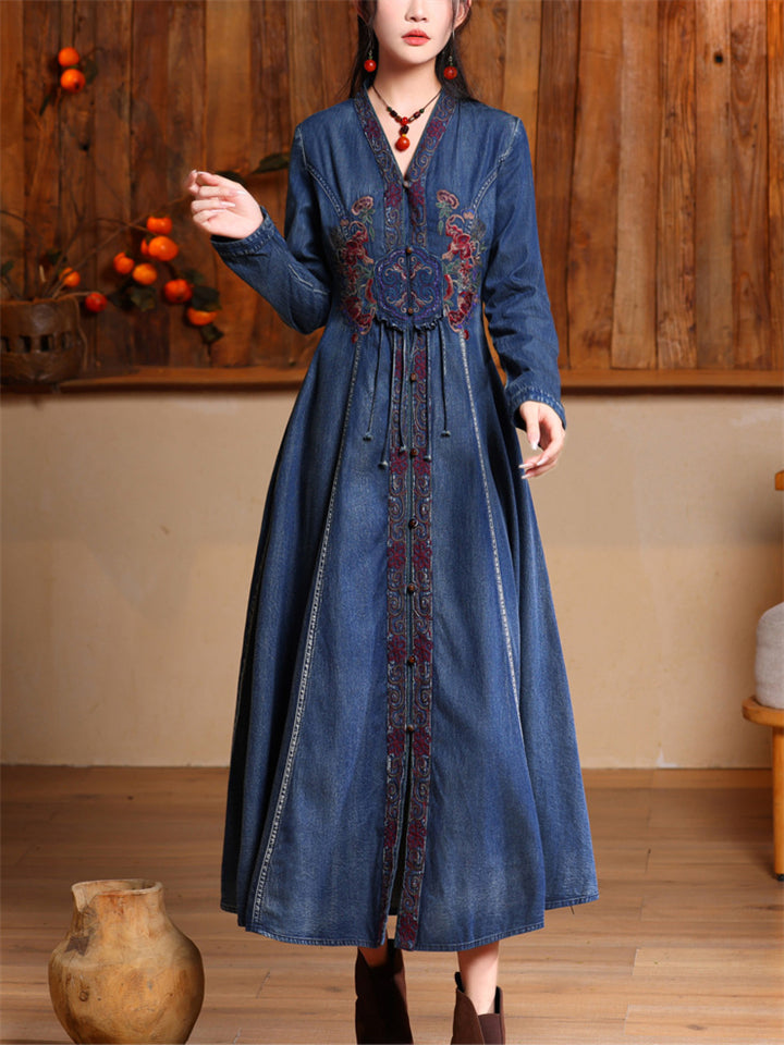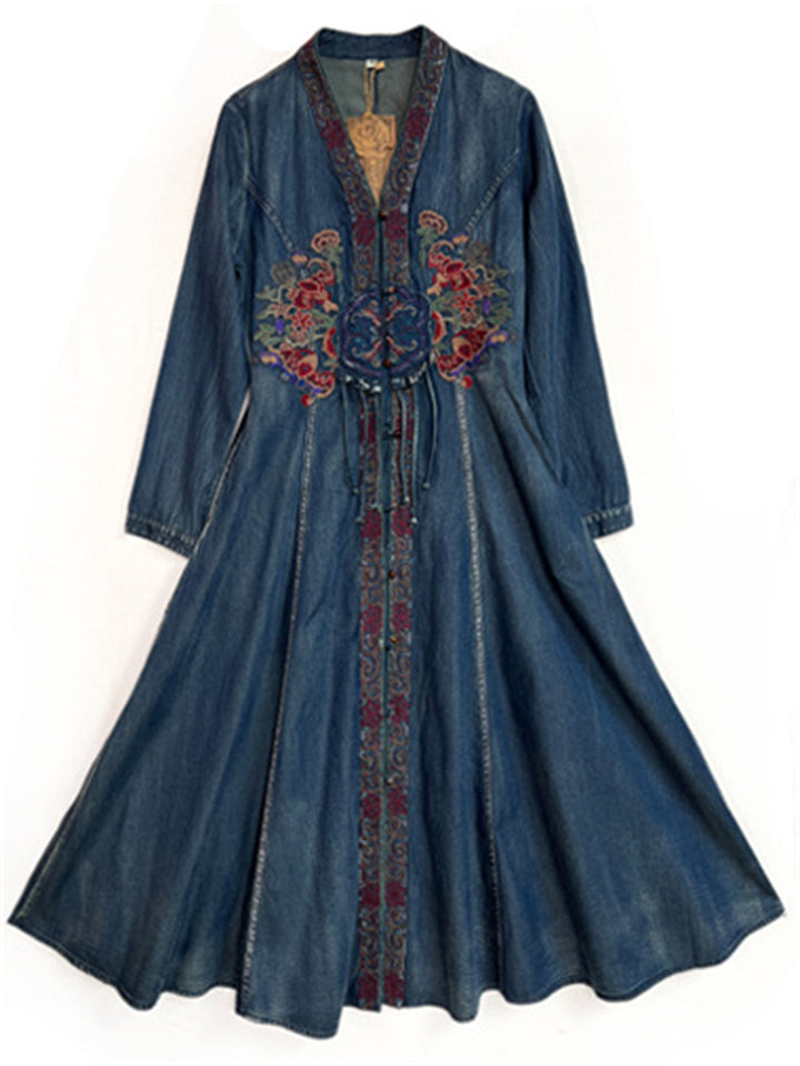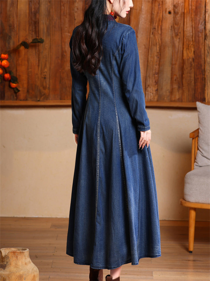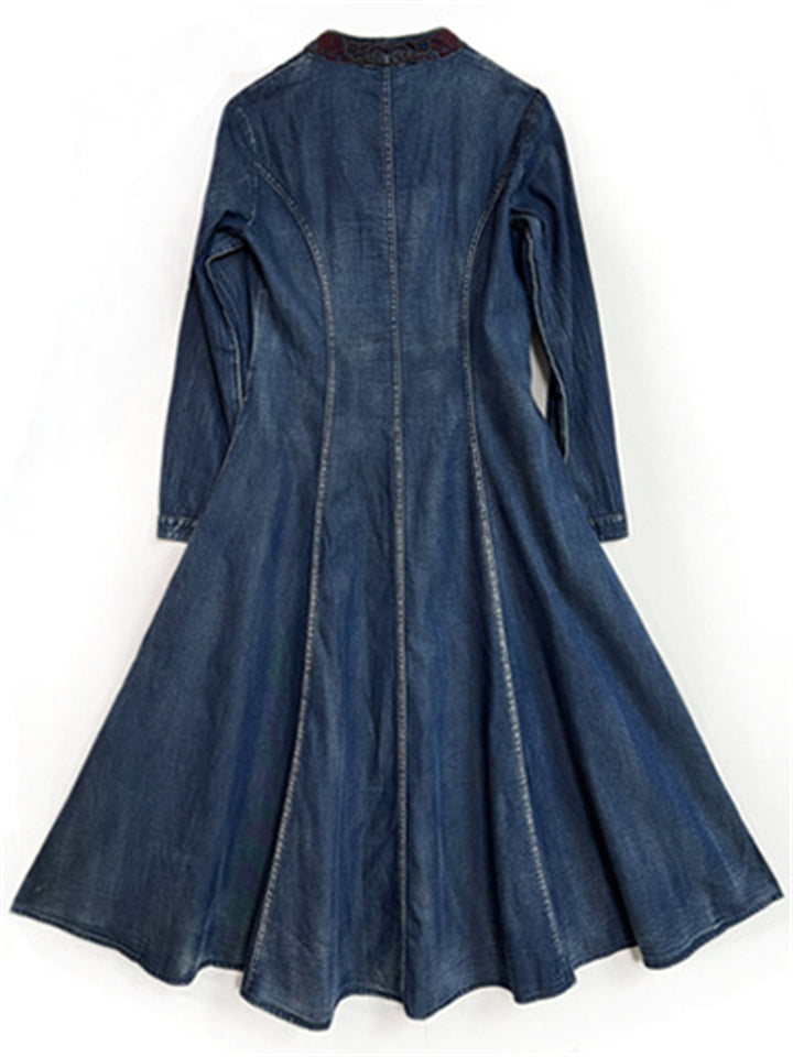 Women's Chic Embroidery Single Breasted Mid-Length Denim Dress