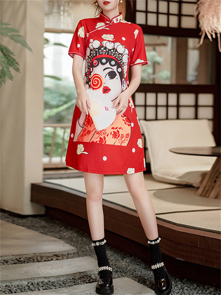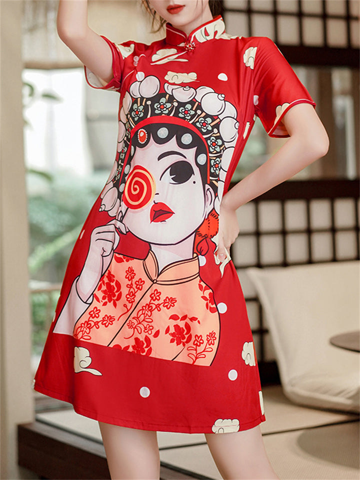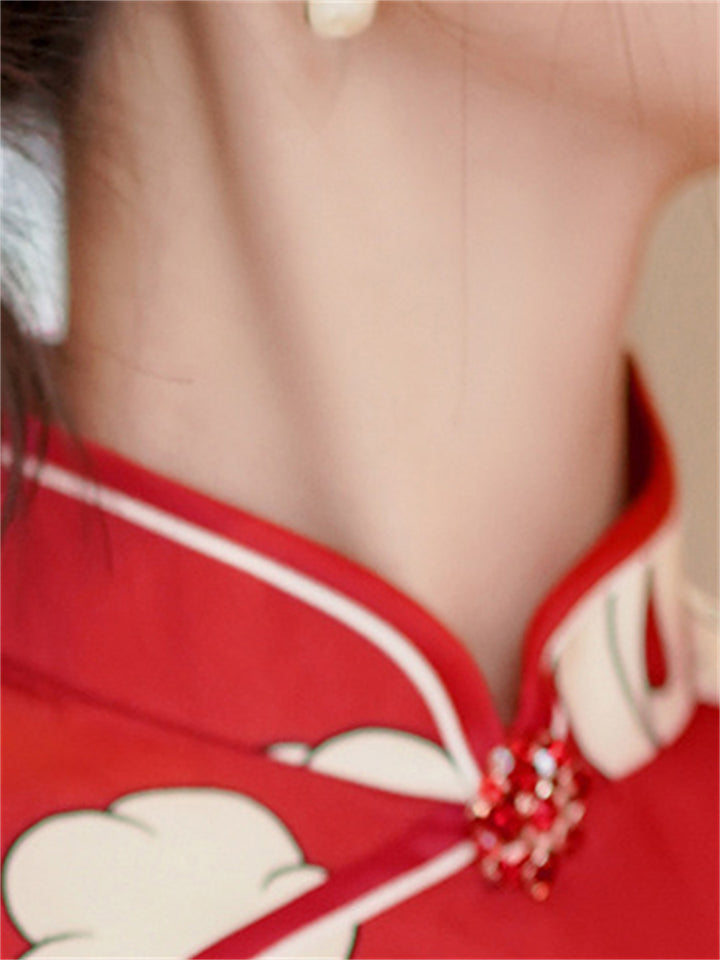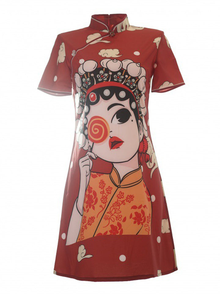 Wine Red Mini Qipao with Ancient Loong Jacquard