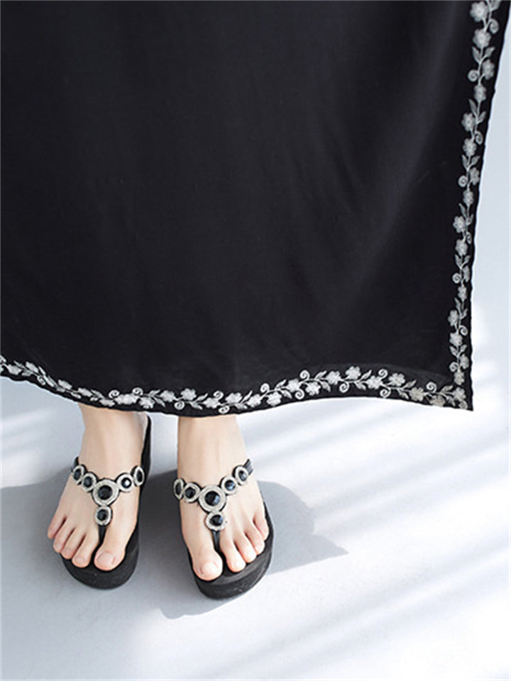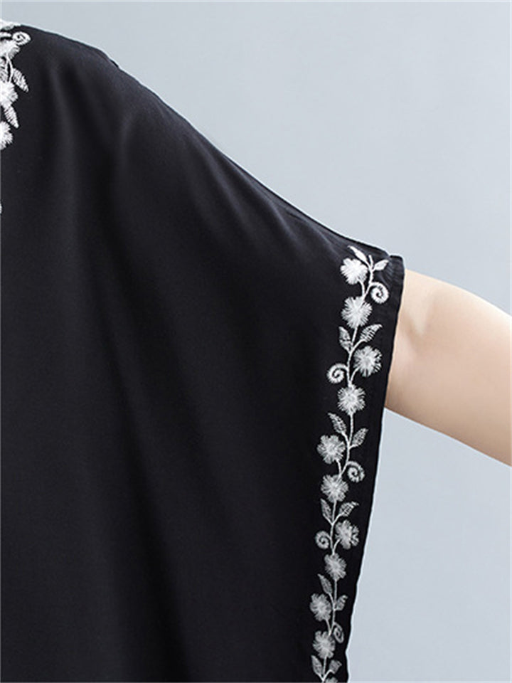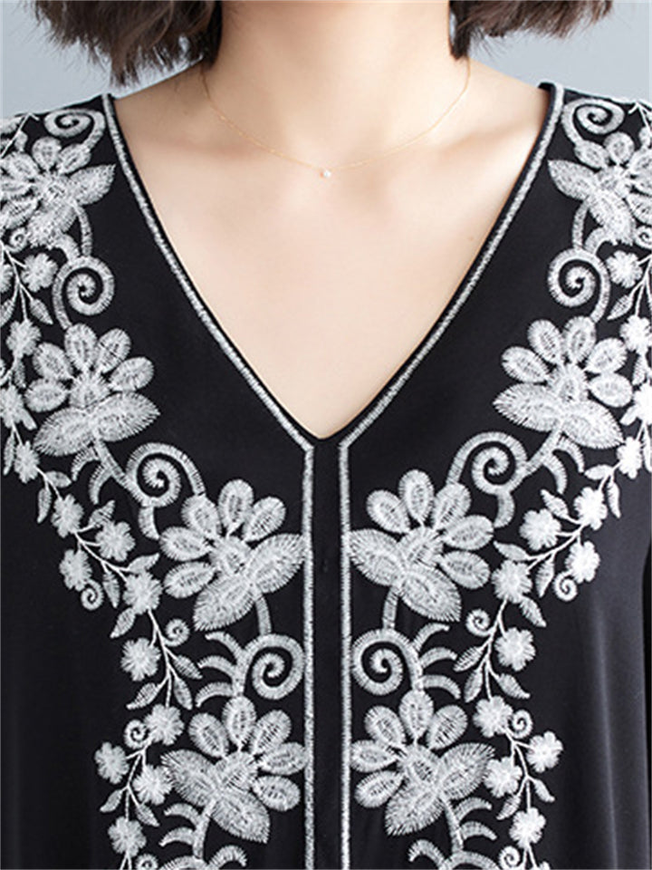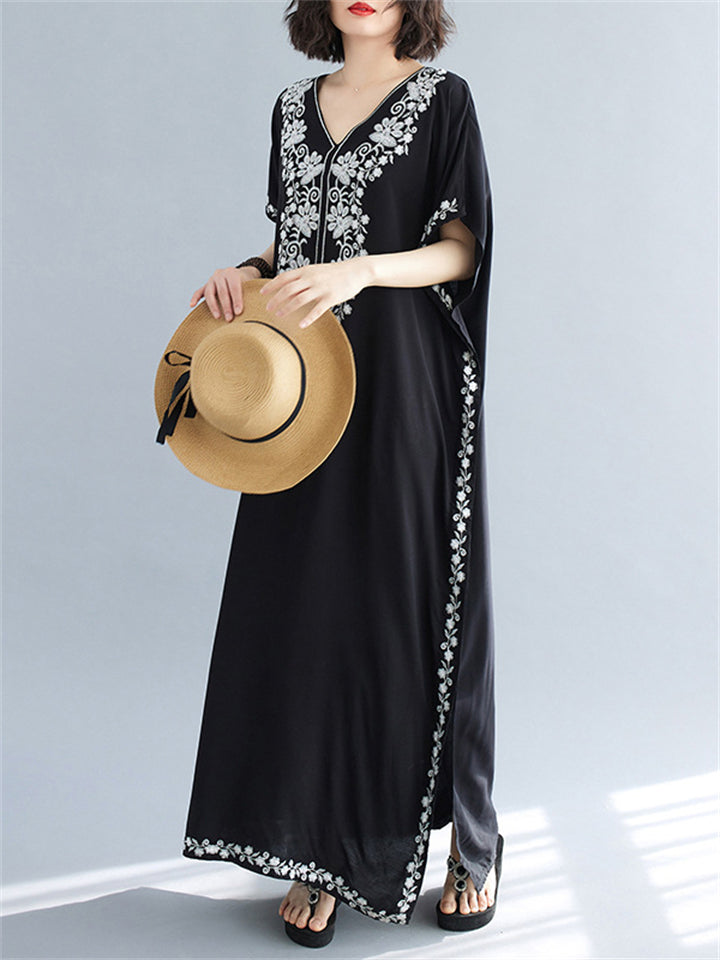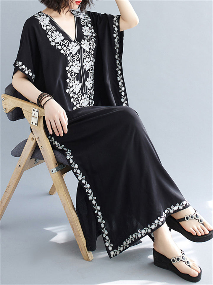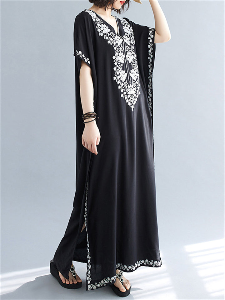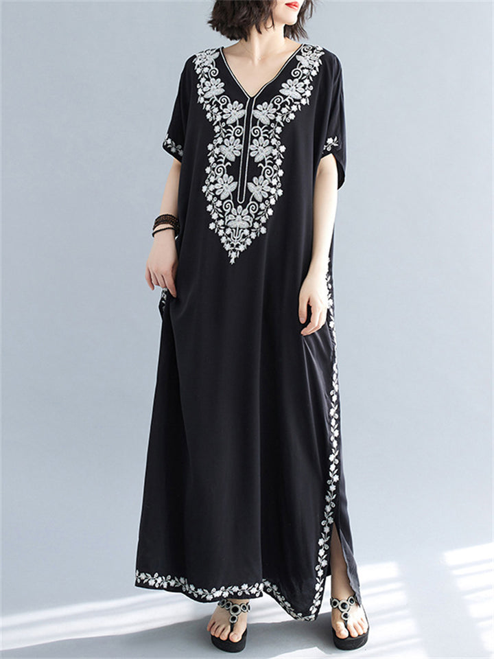Women's Comfortable Floral Embroideried V Neck Kaftan Dress