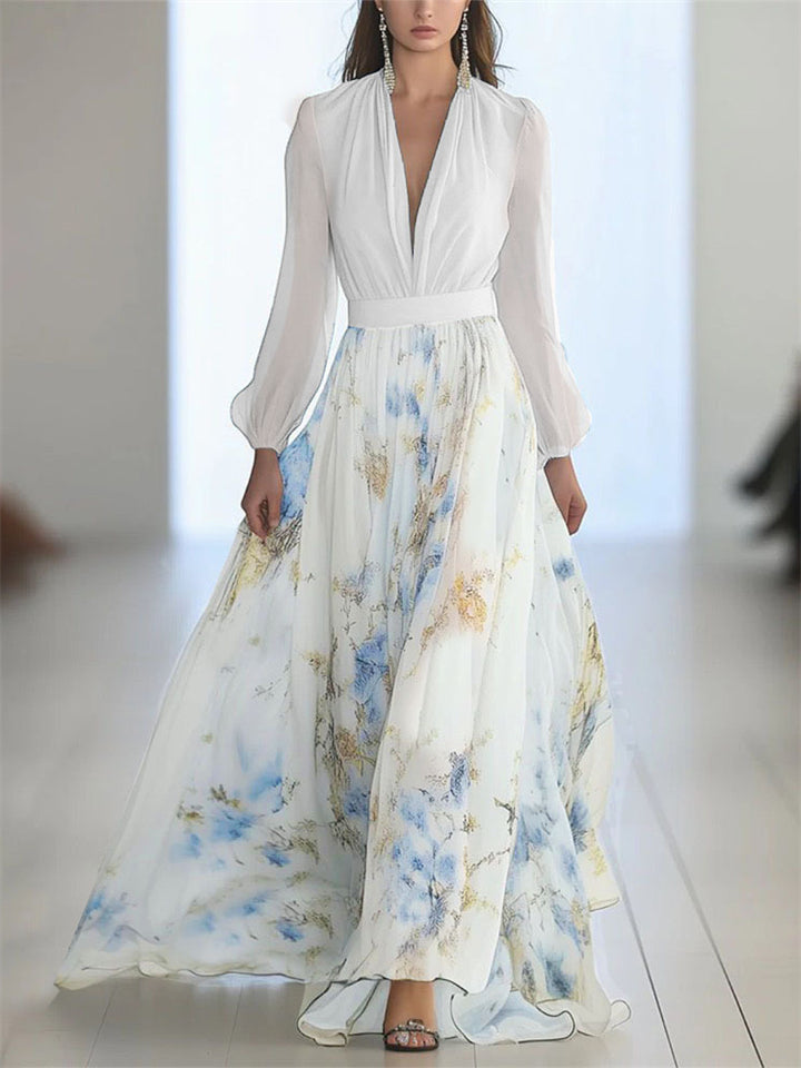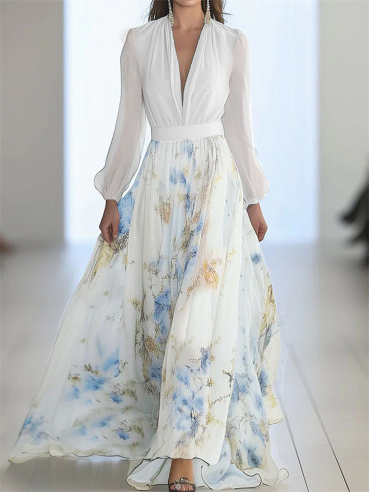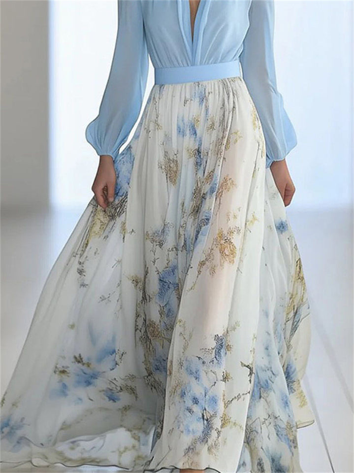 Women's Contrast Color Patchwork Long Sleeve V Neck Maxi Dress