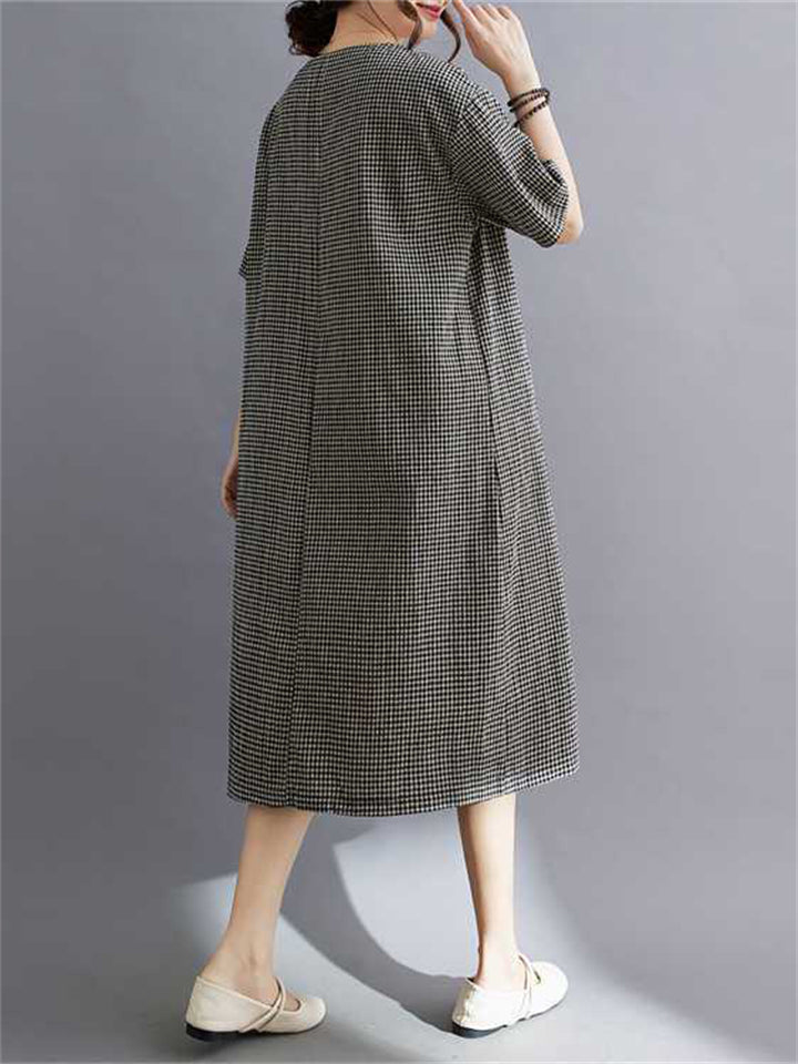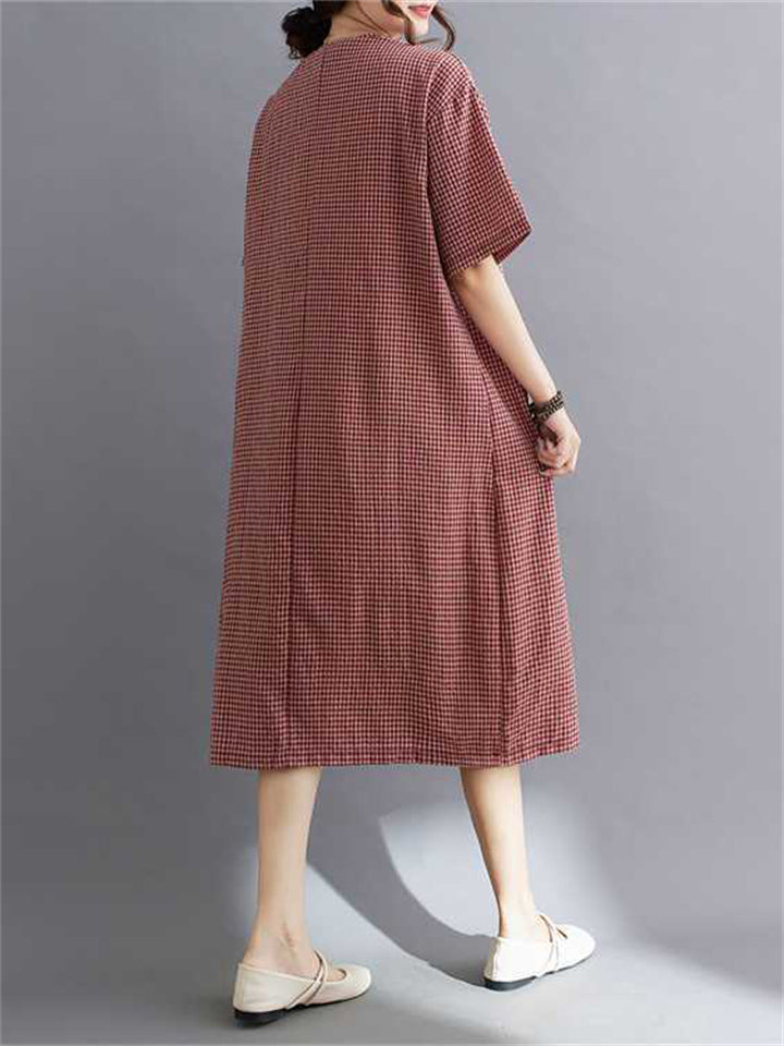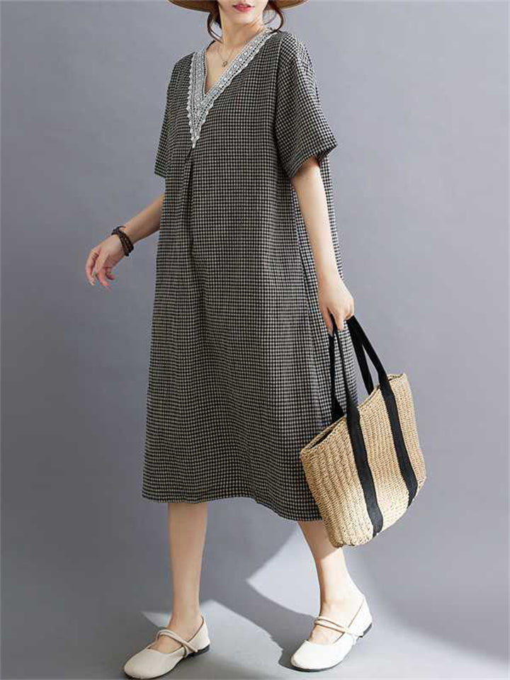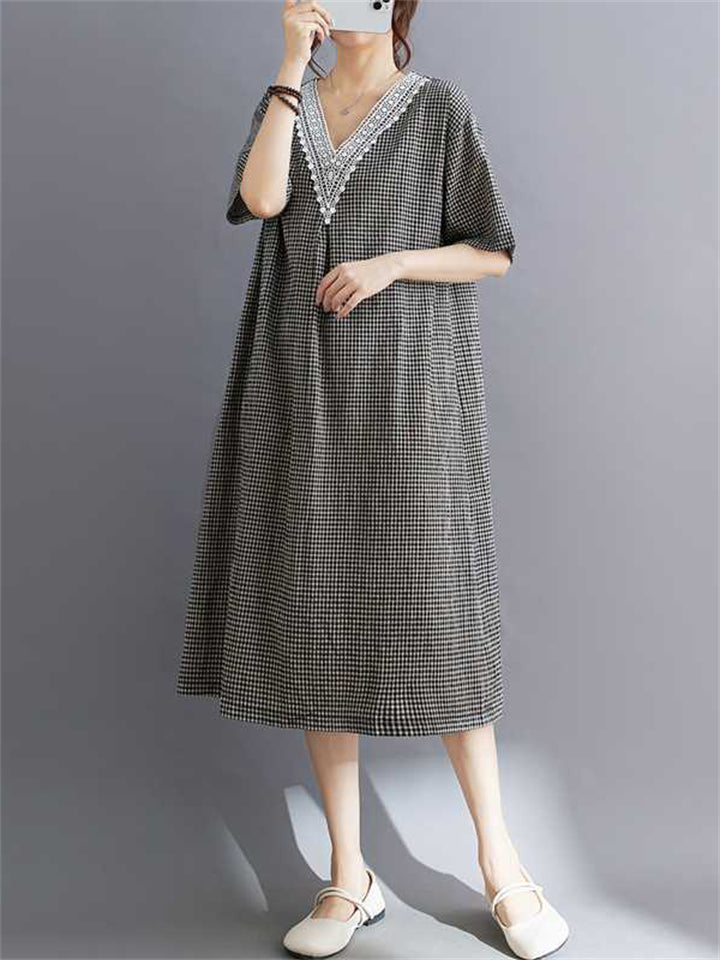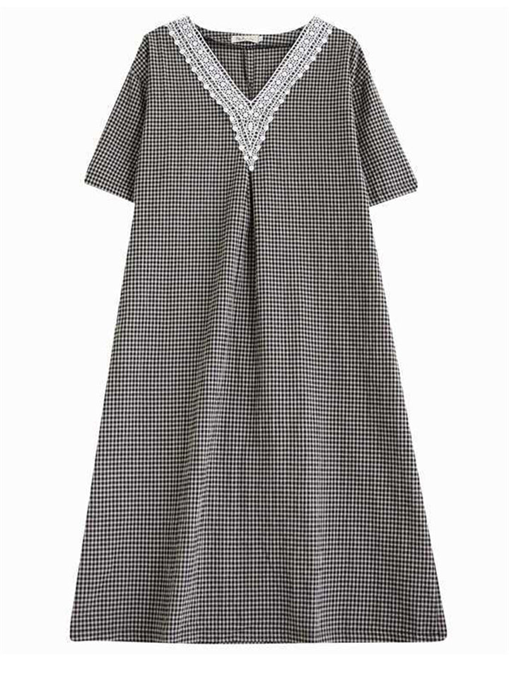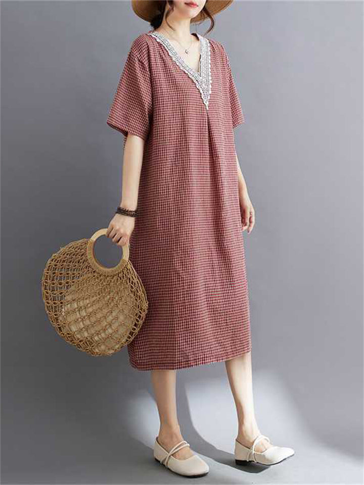 Women's Cotton Linen Lace V-Neck A-Line Plaid Dress