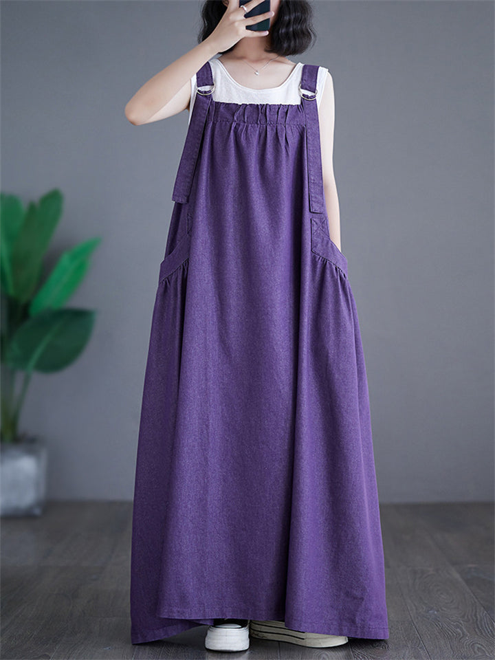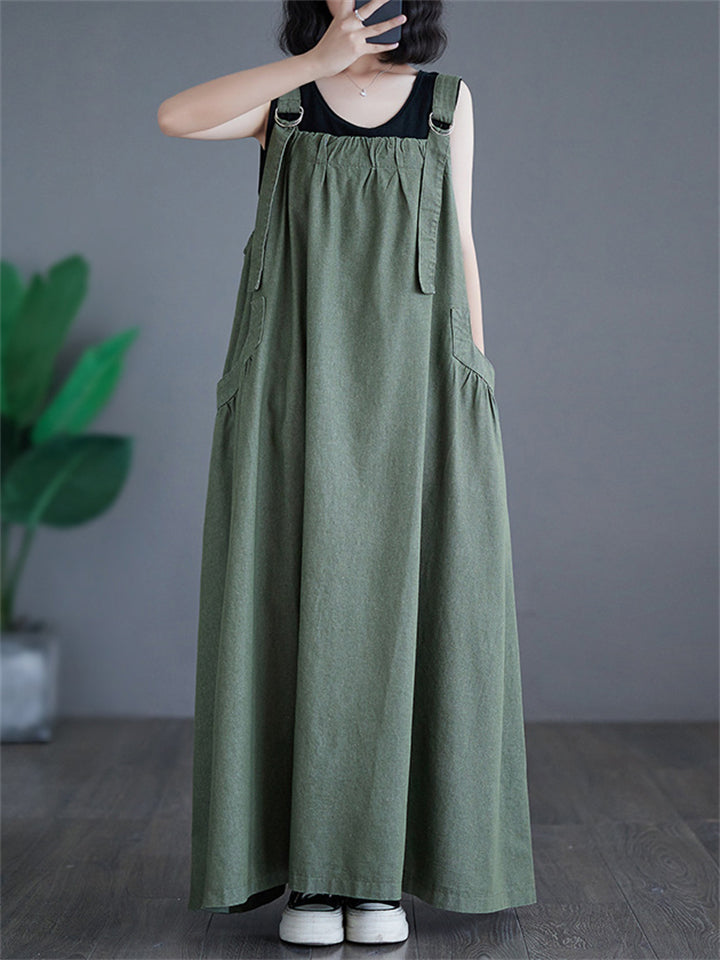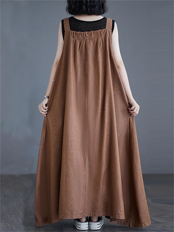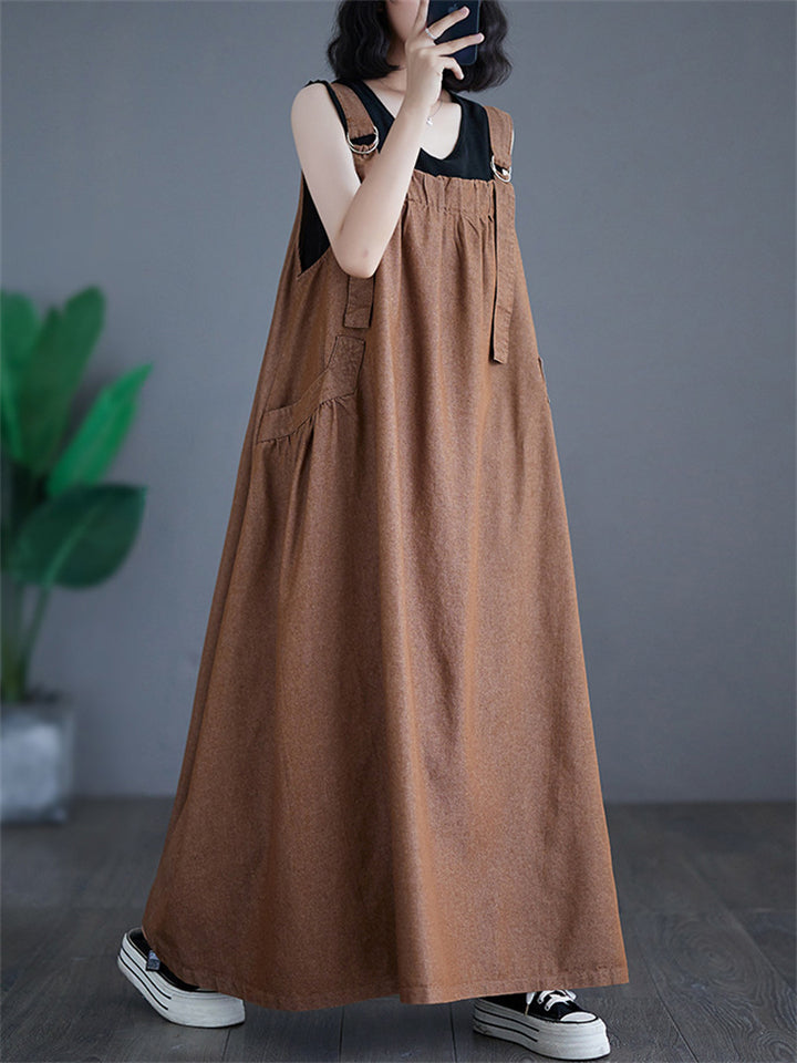 Women's Solid Color Round Neck Pockets Corduroy Vest Dress