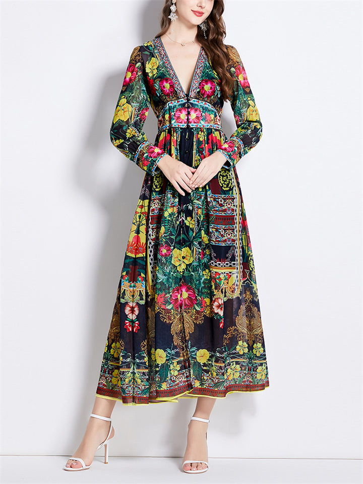 Women's Trendy Ethnic Holiday Style Print V Neck Maxi Dress