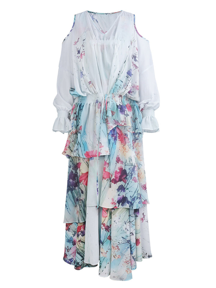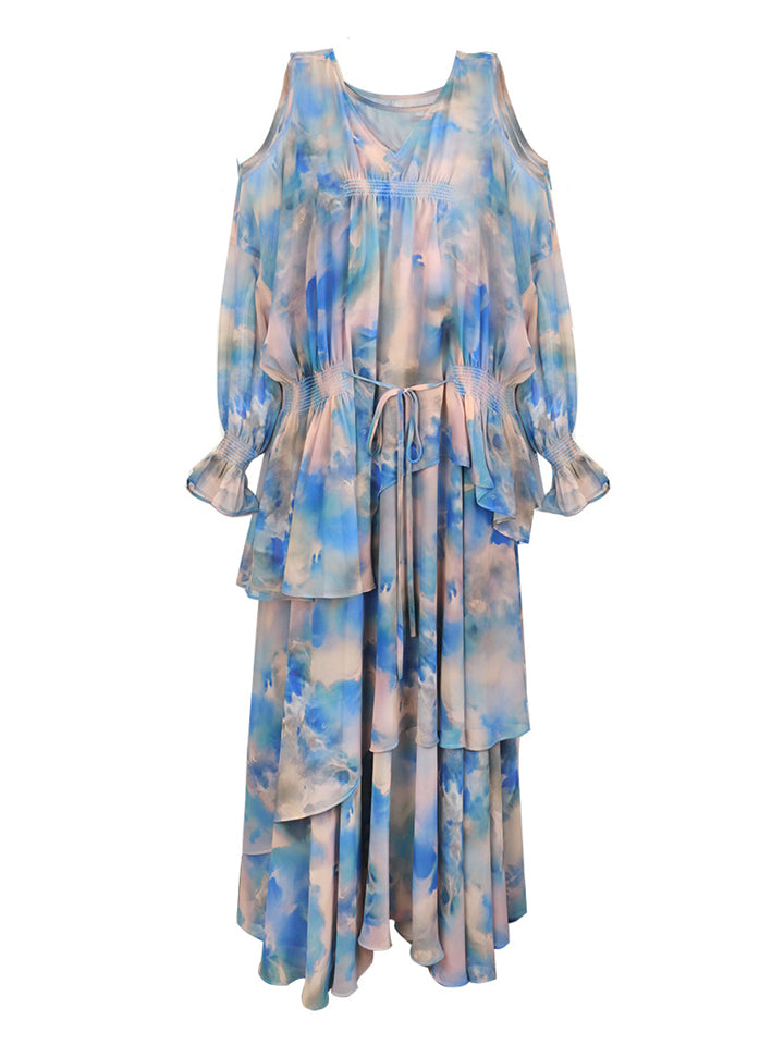Women's Elegant Print Shoulder Cut Long Sleeve Shirt & Strap Dress