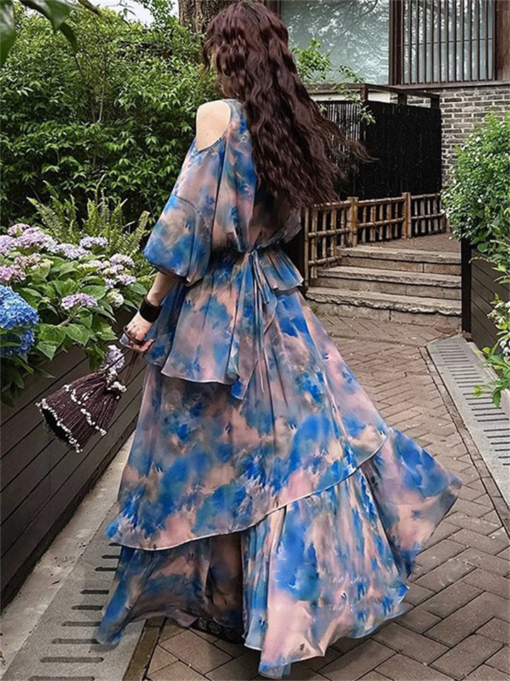 Women's Summer Printed Patchwork Half Sleeve Big Hem Maxi Dress