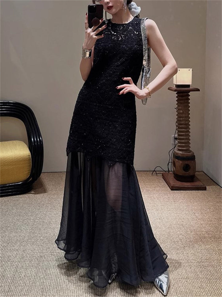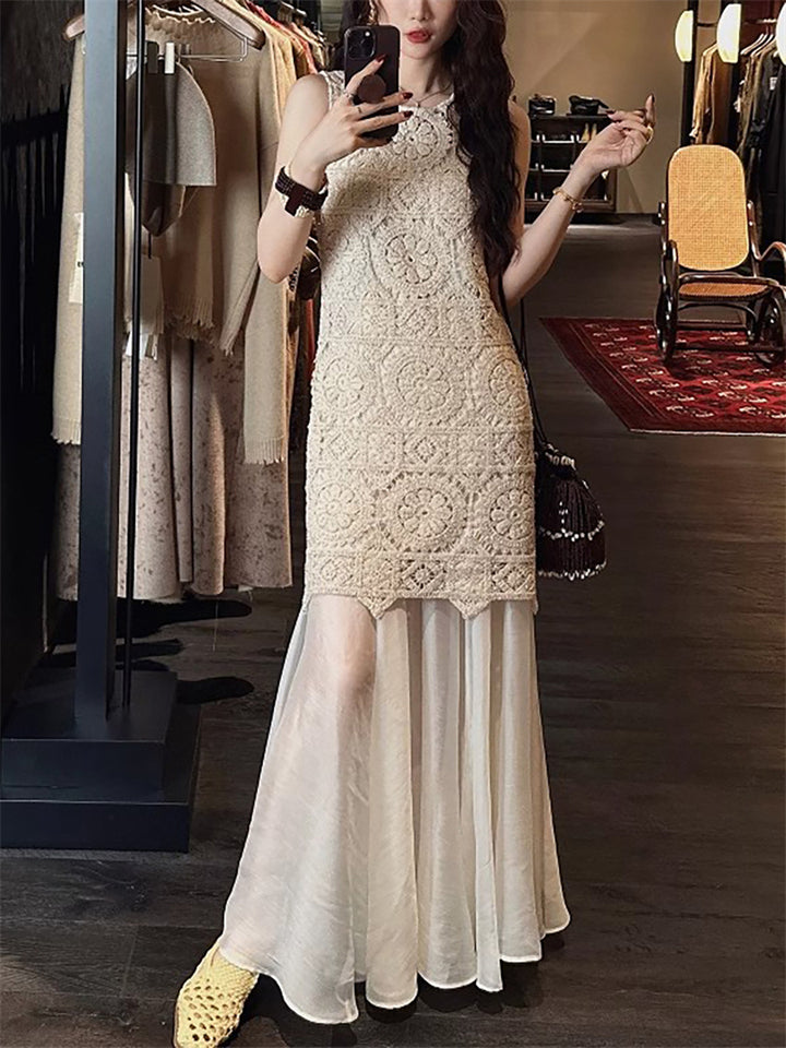 Women's Elegant Solid Color Hollow Patchwork Sleeveless Dress