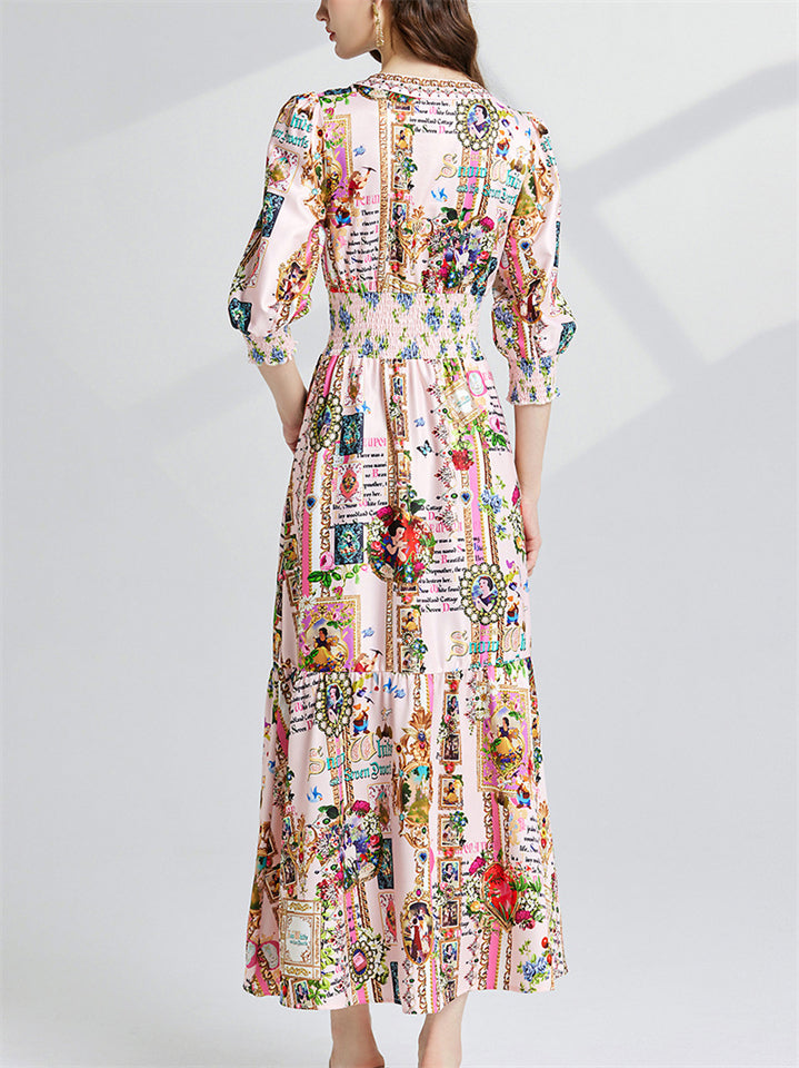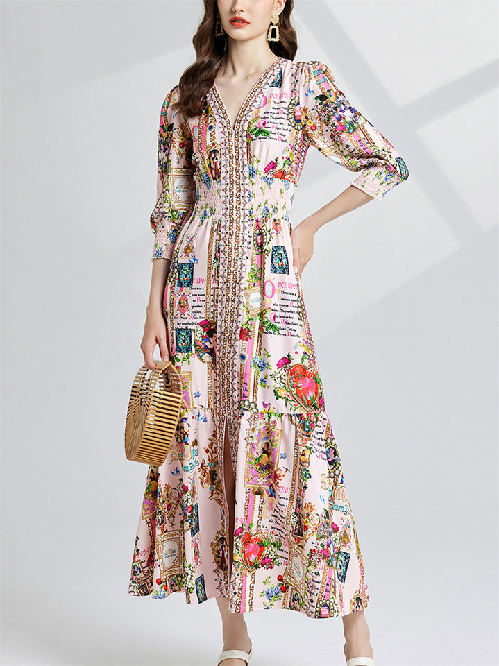 Women's Elegant V Neck 3/4 Sleeve Letter Floral Print Dress