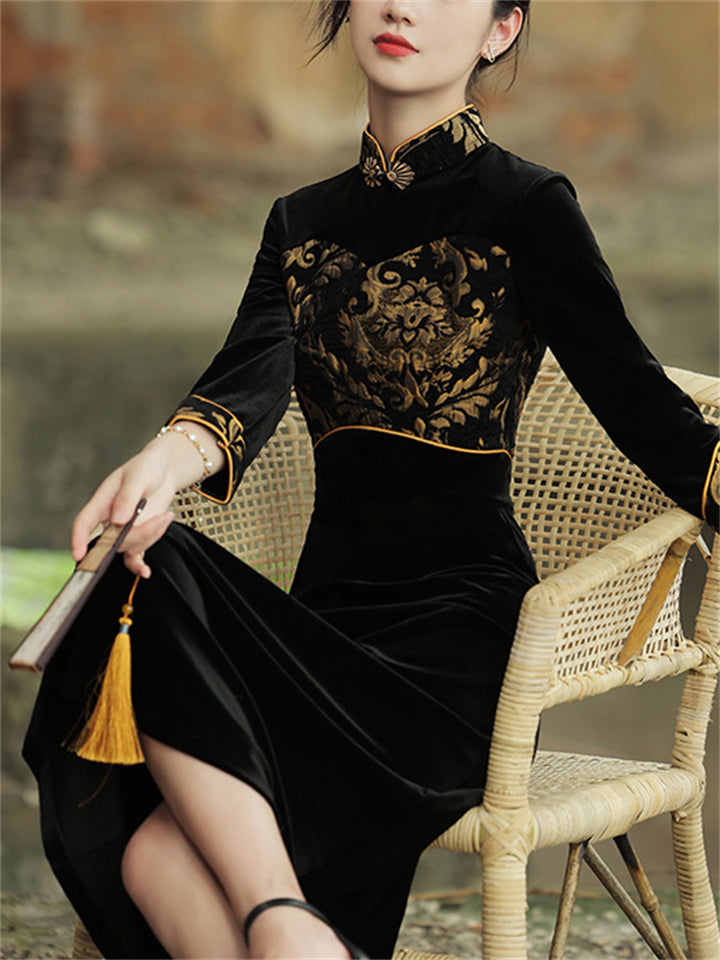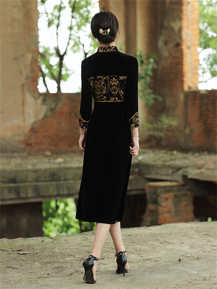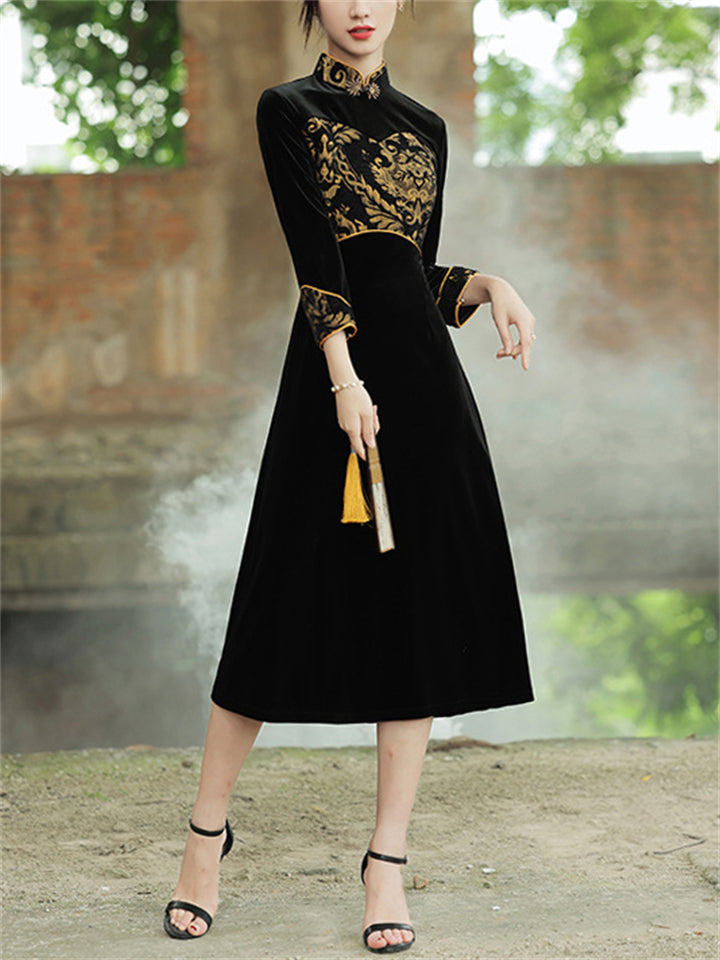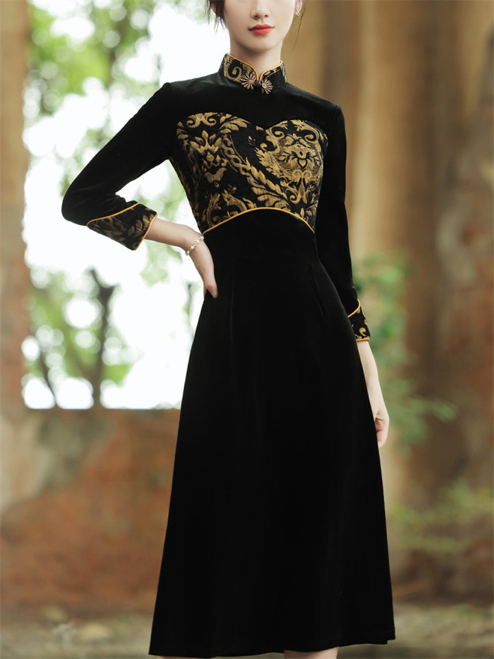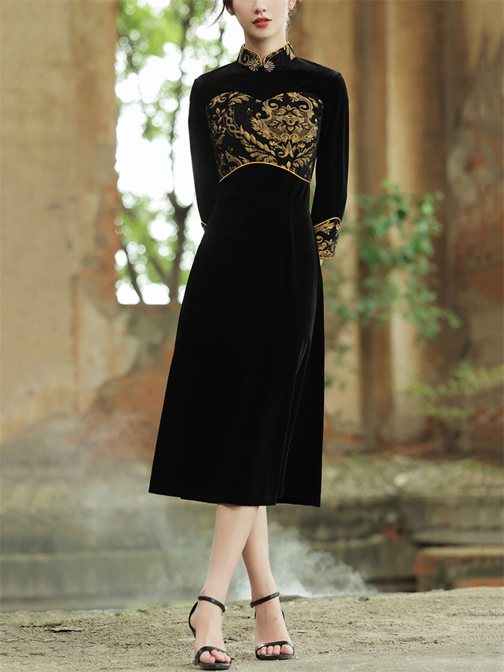 Women's Elegant Velvet Stand Collar Midi Embroidery Qipao