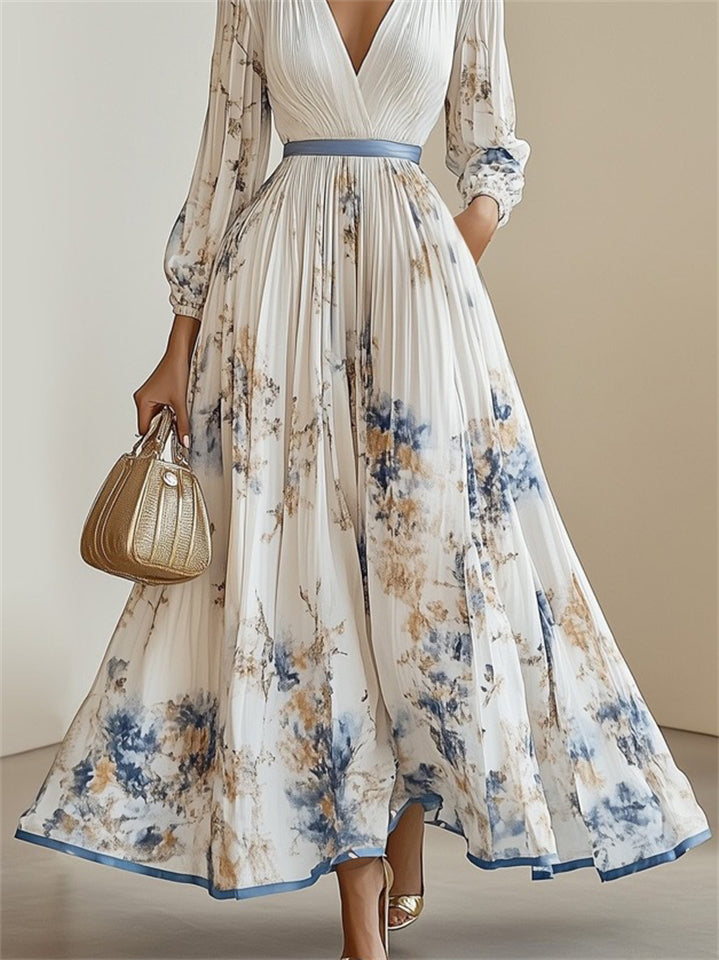 Women's Elegant White V-Neck Print Holiday Style Pleated Dress
