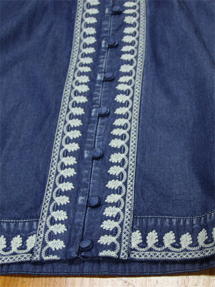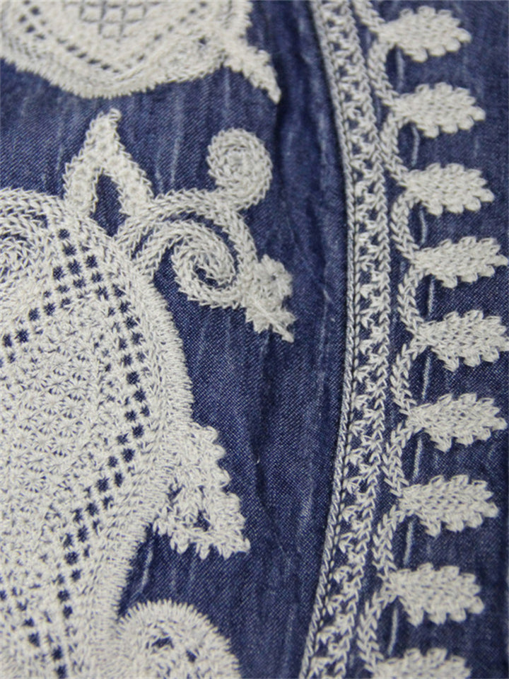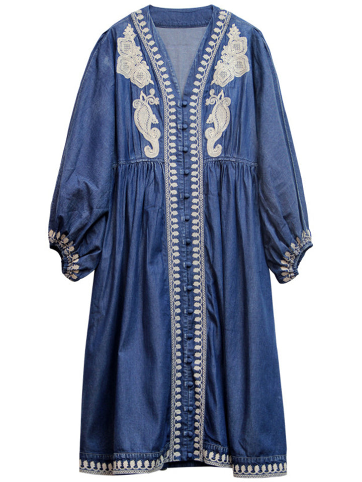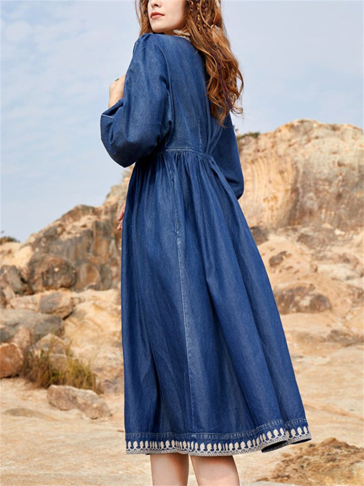 Women's Ethnic Style V Neck Puff Sleeve High-Rise Denim Dress