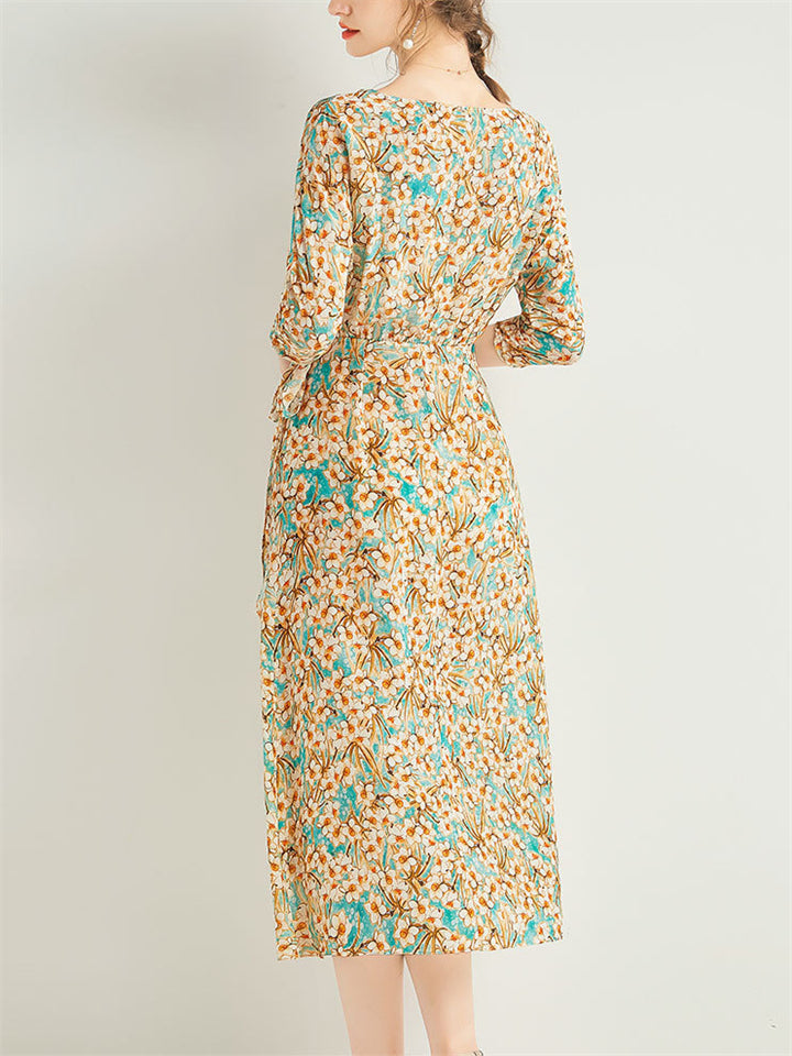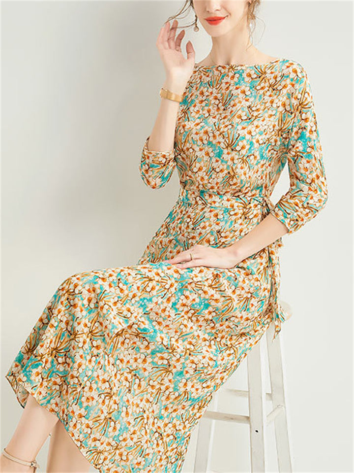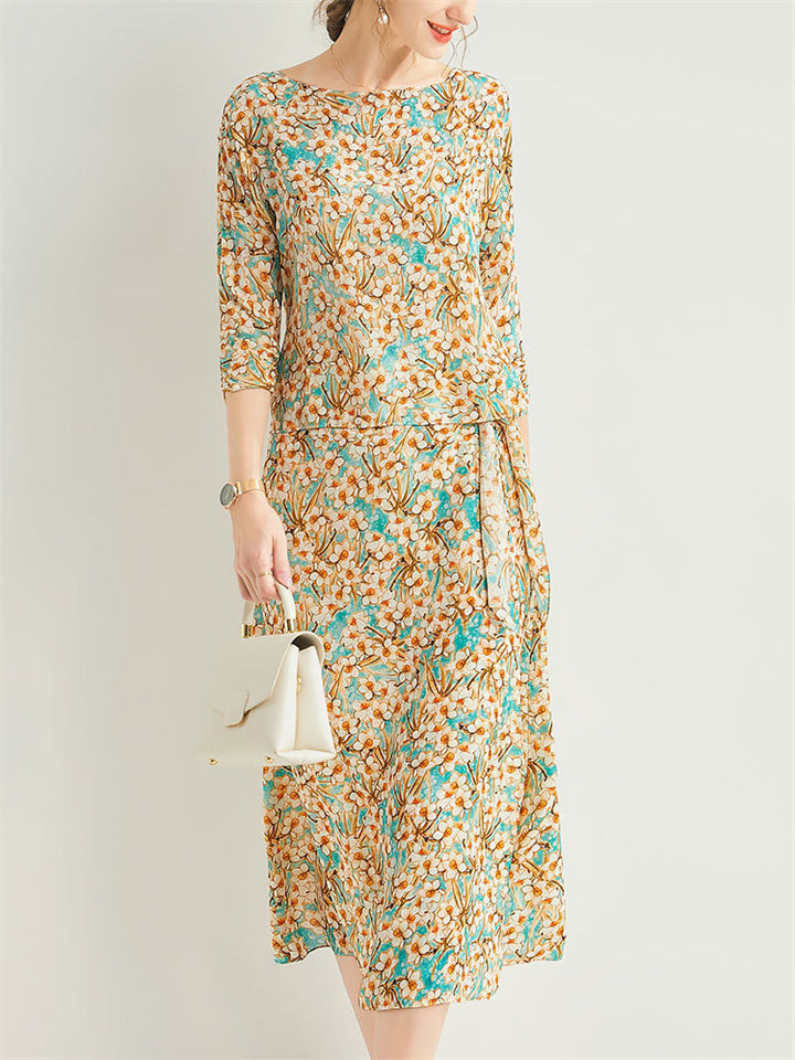 Women's Flowy Mulberry Silk Waisted False Two Piece Floral Dress