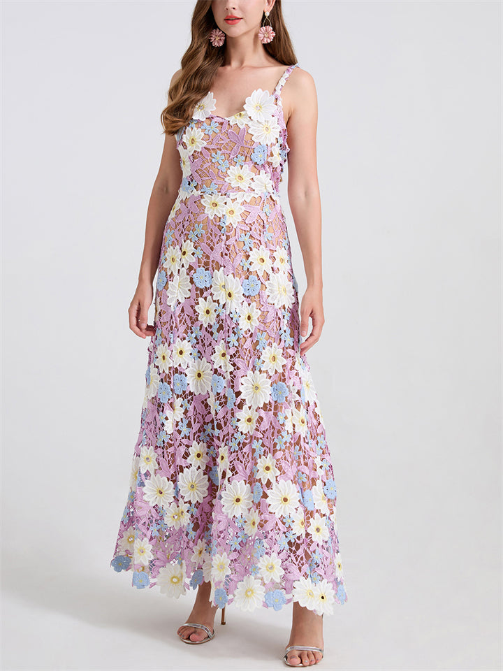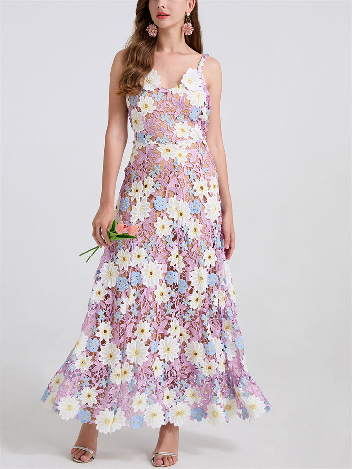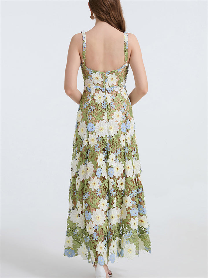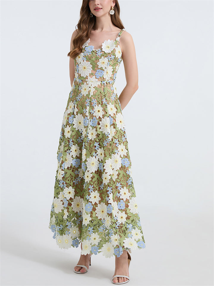 Women's Lace Flowers Embroidery Strap Big Hem Dress