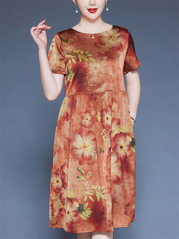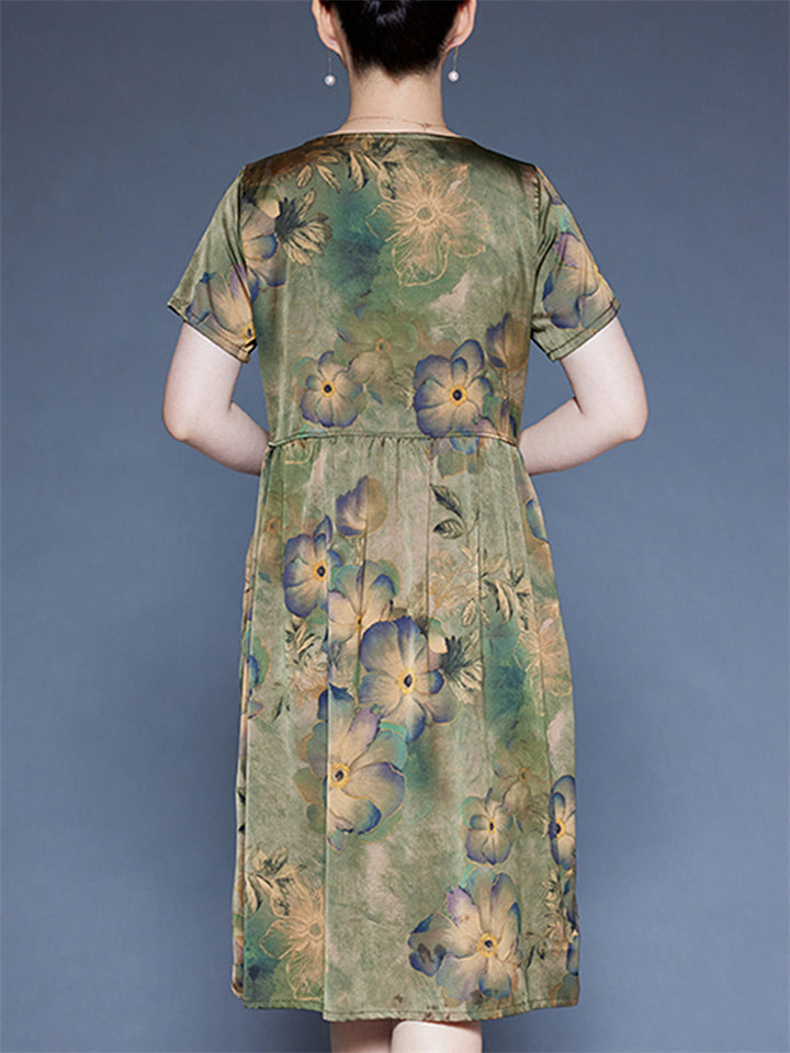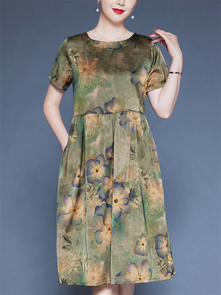 Women's Loose Floral Print O-neck Short Sleeve Dress