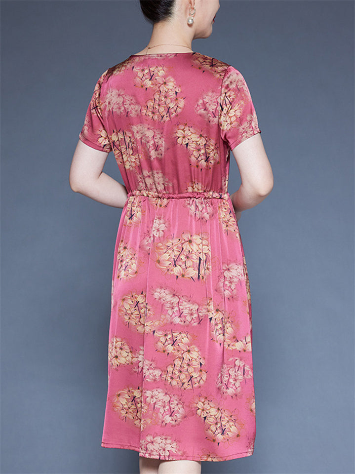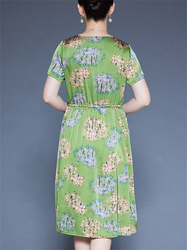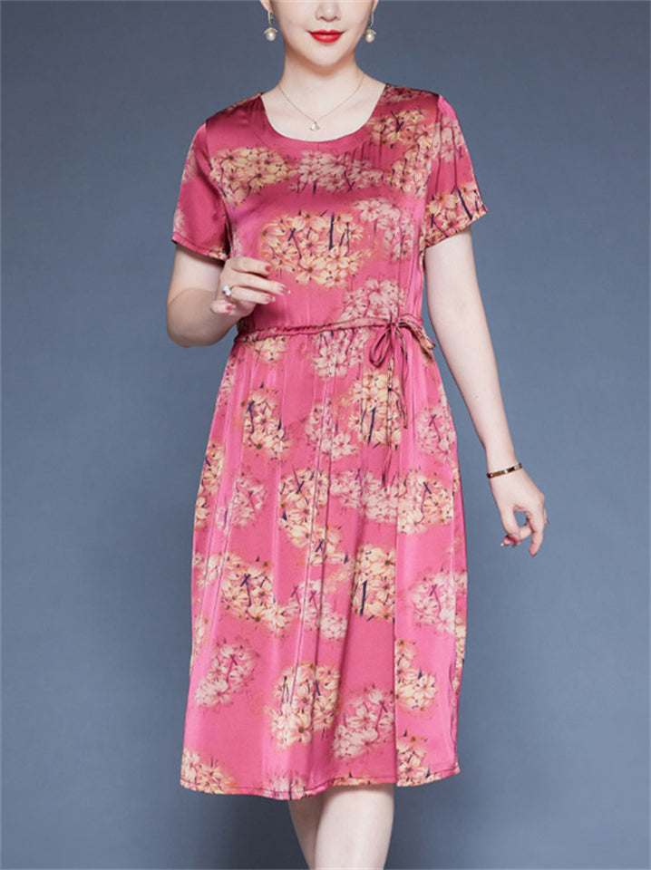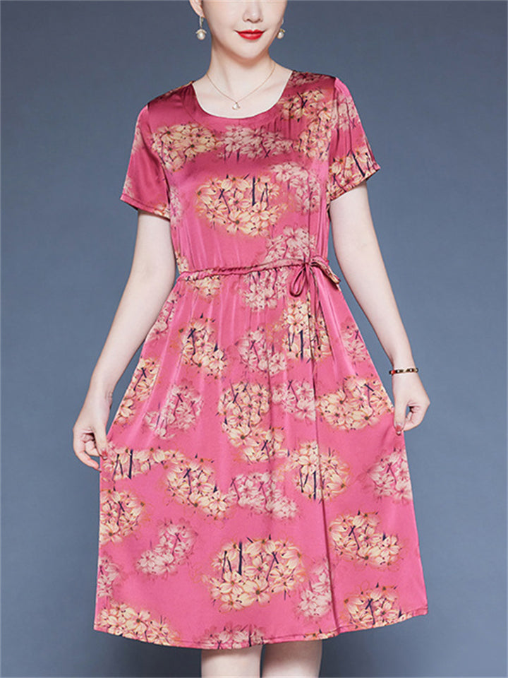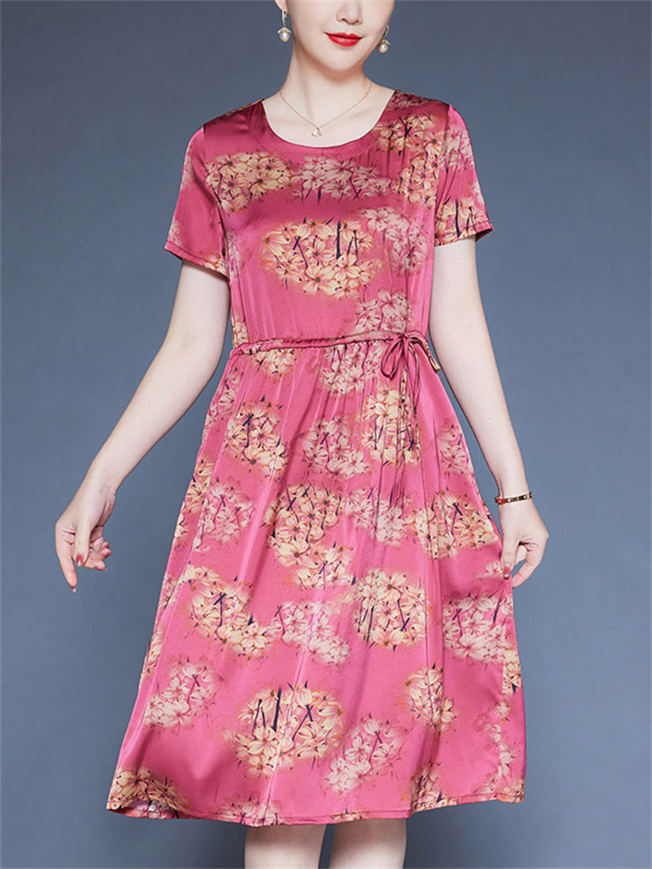 Women's Loose Floral Print Tie-waist O-neck Short Sleeve Dress