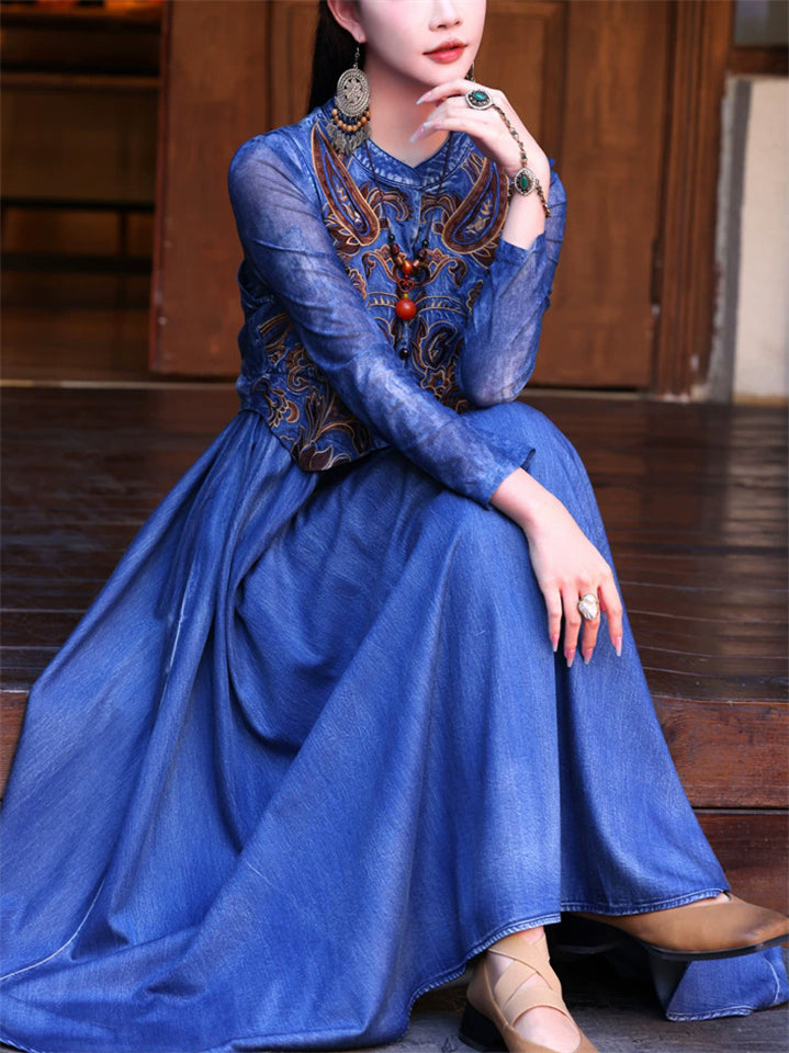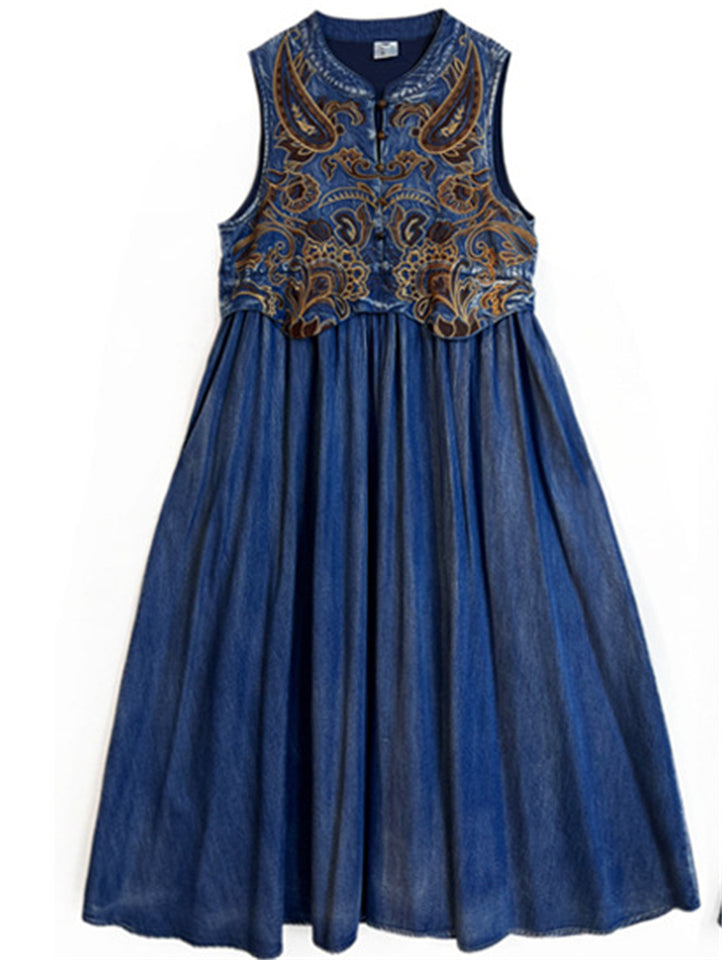Women's O-neck Sleeveless Floral Embroidery Denim Tank Dress