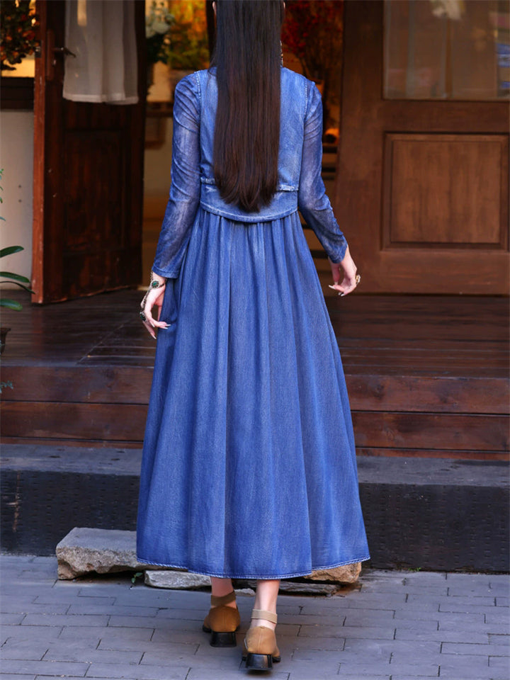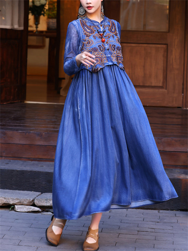 Women's Printed Denim Chiffon Patchwork Big Hem Dress