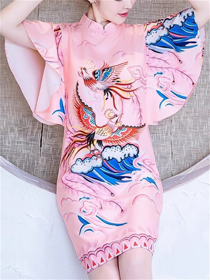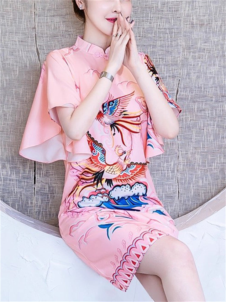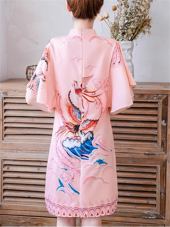 Women's Pink Elegant Phoenix Printed QIPAO Style Knee Length Dress