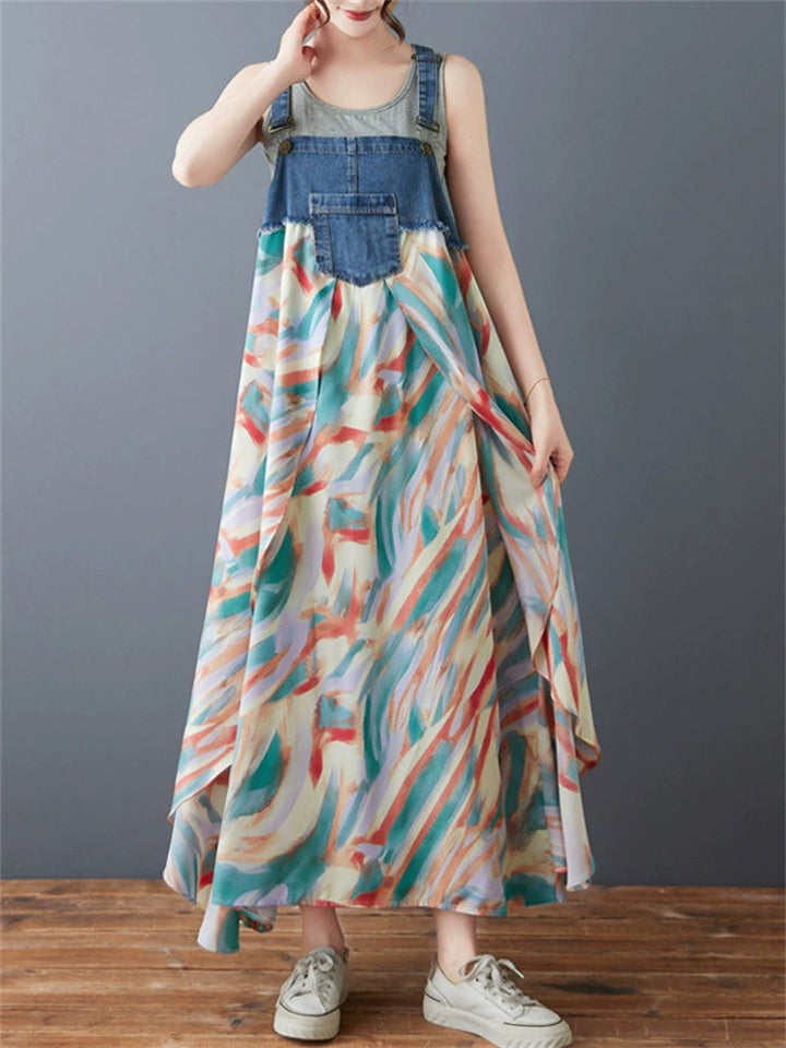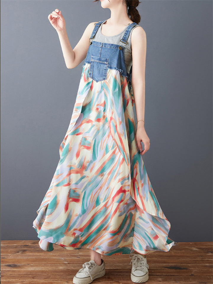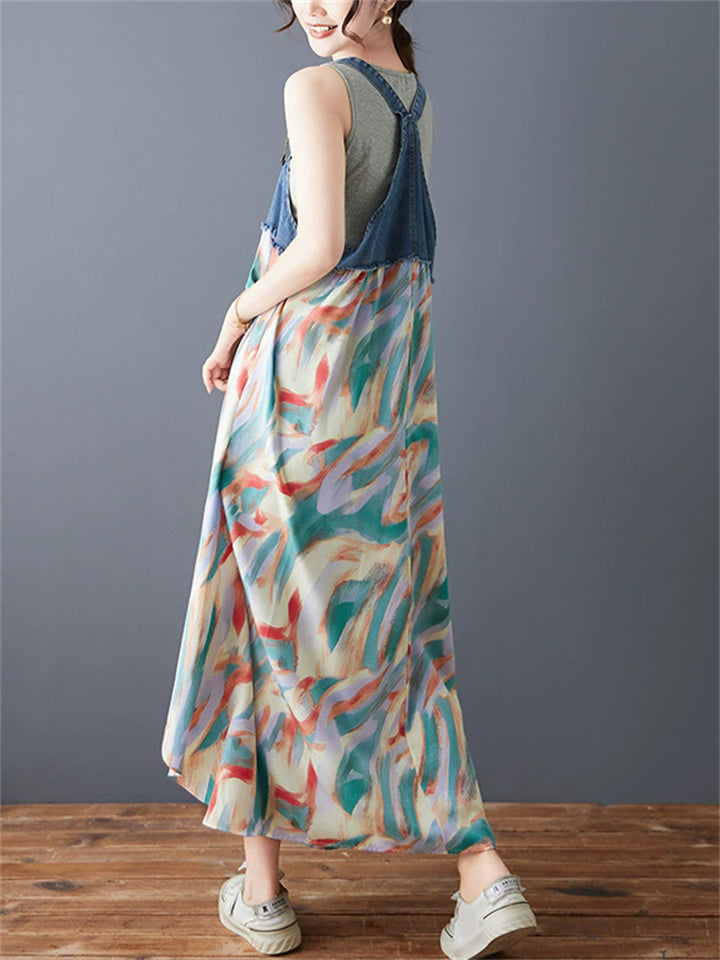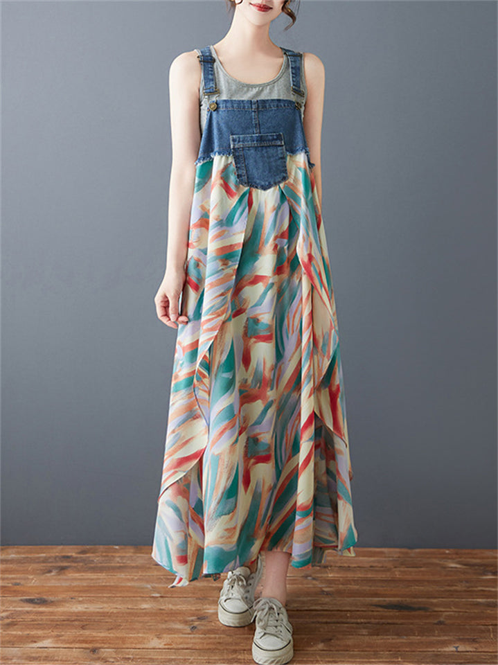 Women's Printed Denim Chiffon Patchwork Big Hem Dress
