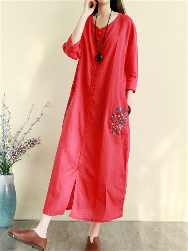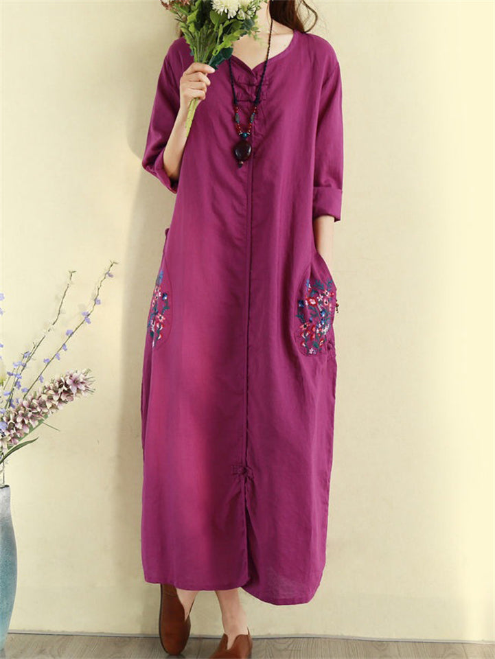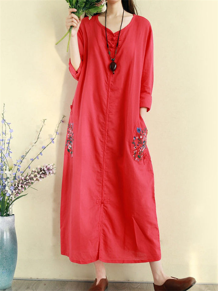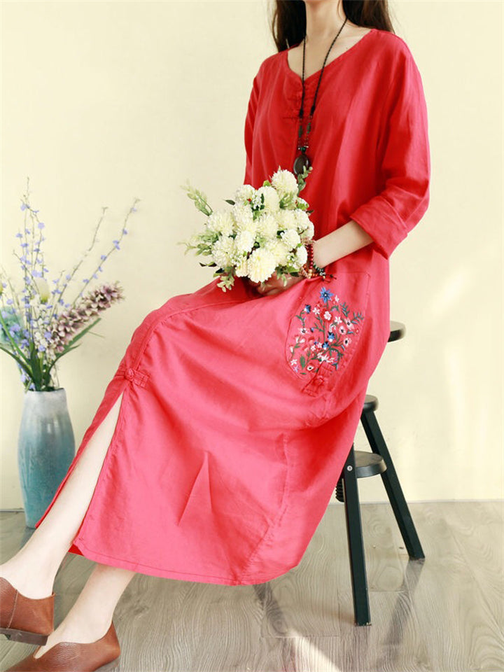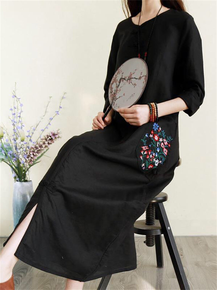 Women's Retro Ethnic Style Flower Embroidery Half Sleeve Long Dress